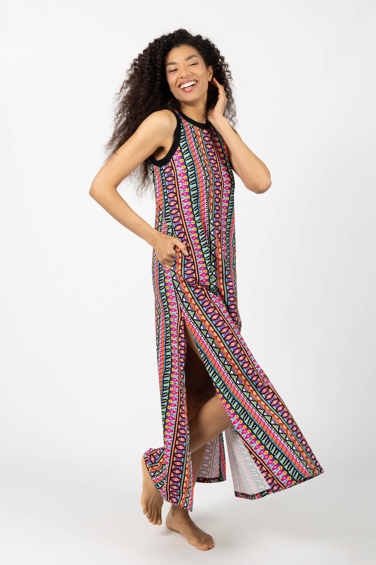 Długa sukienka o swobodnej, luźnej formie, która miękko układa się na sylwetce i porusza się z każdym krokiem. Góra bez rękawów, inspirowana krojem bokserki, nadaje całości lekko sportowy charakter i równoważy długość fasonu.