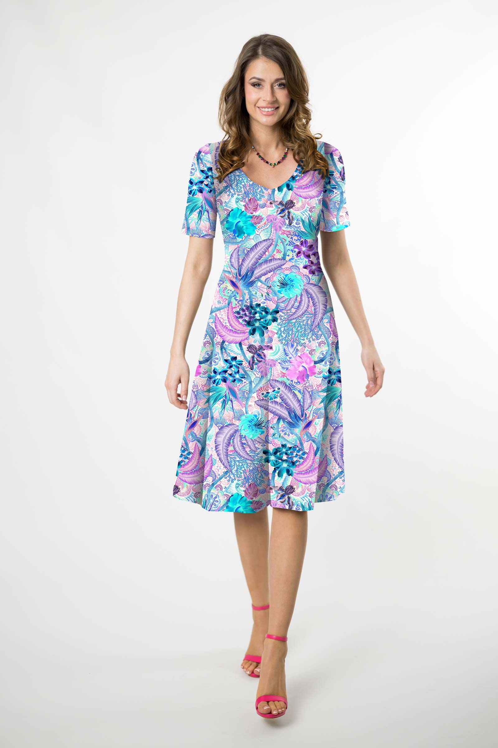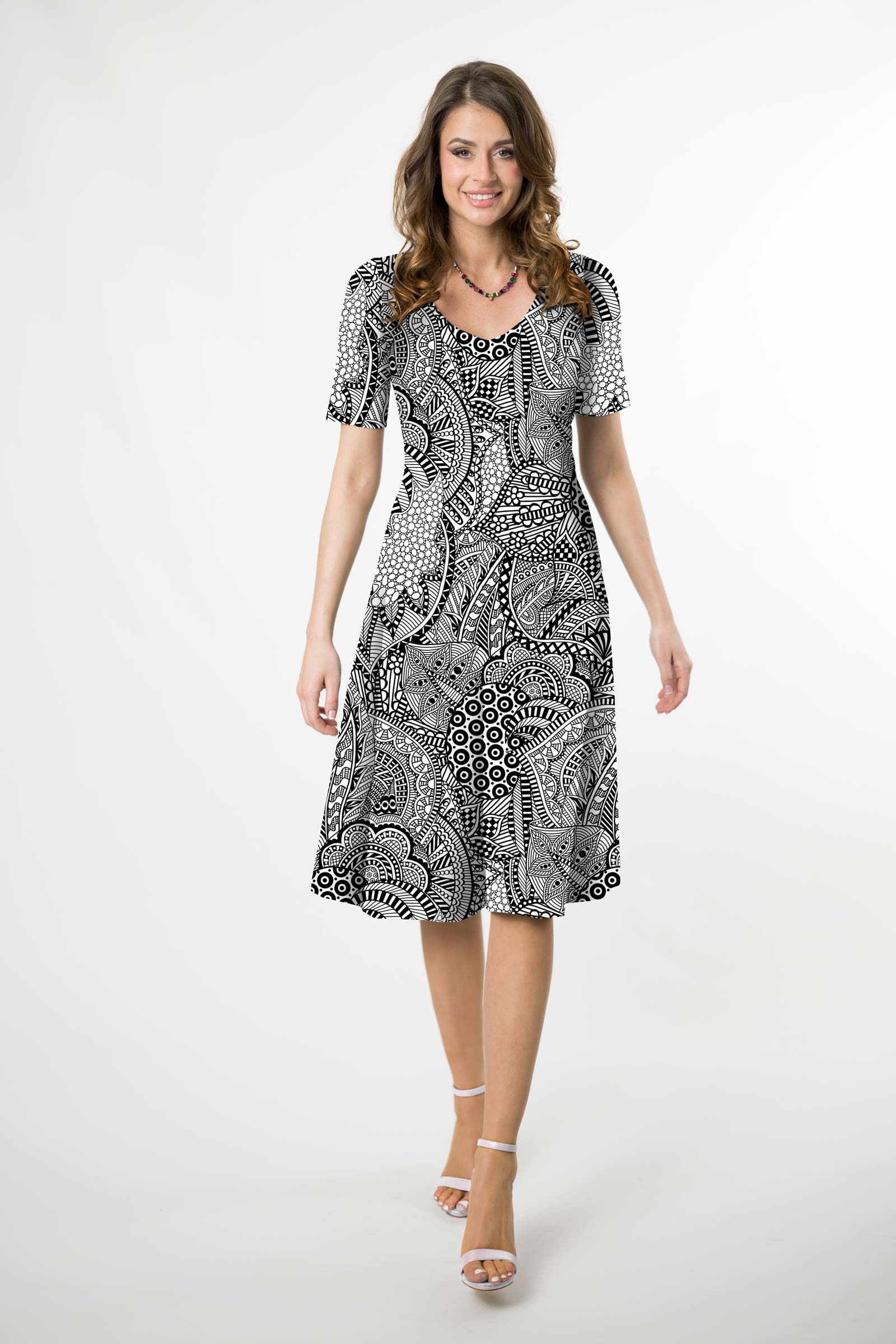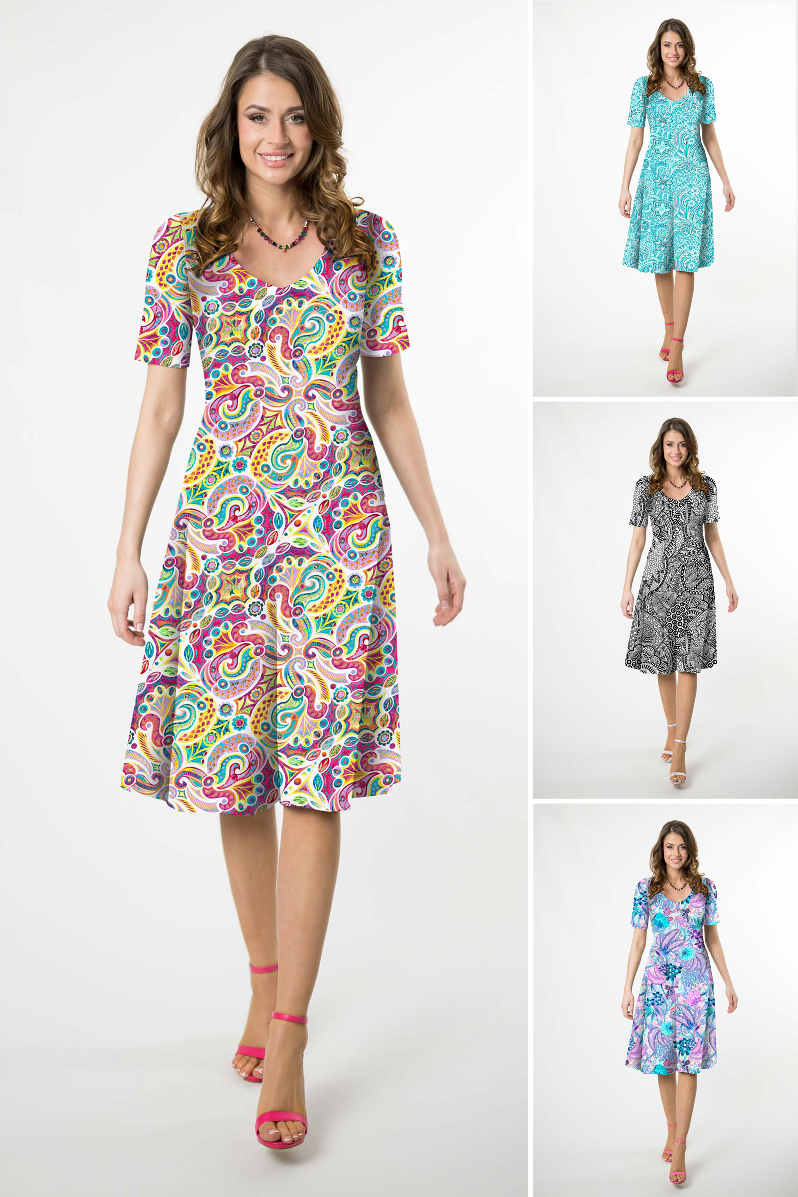 Sukienka midi rozkloszowana V krótki rękaw - WZÓR DO WYBORU