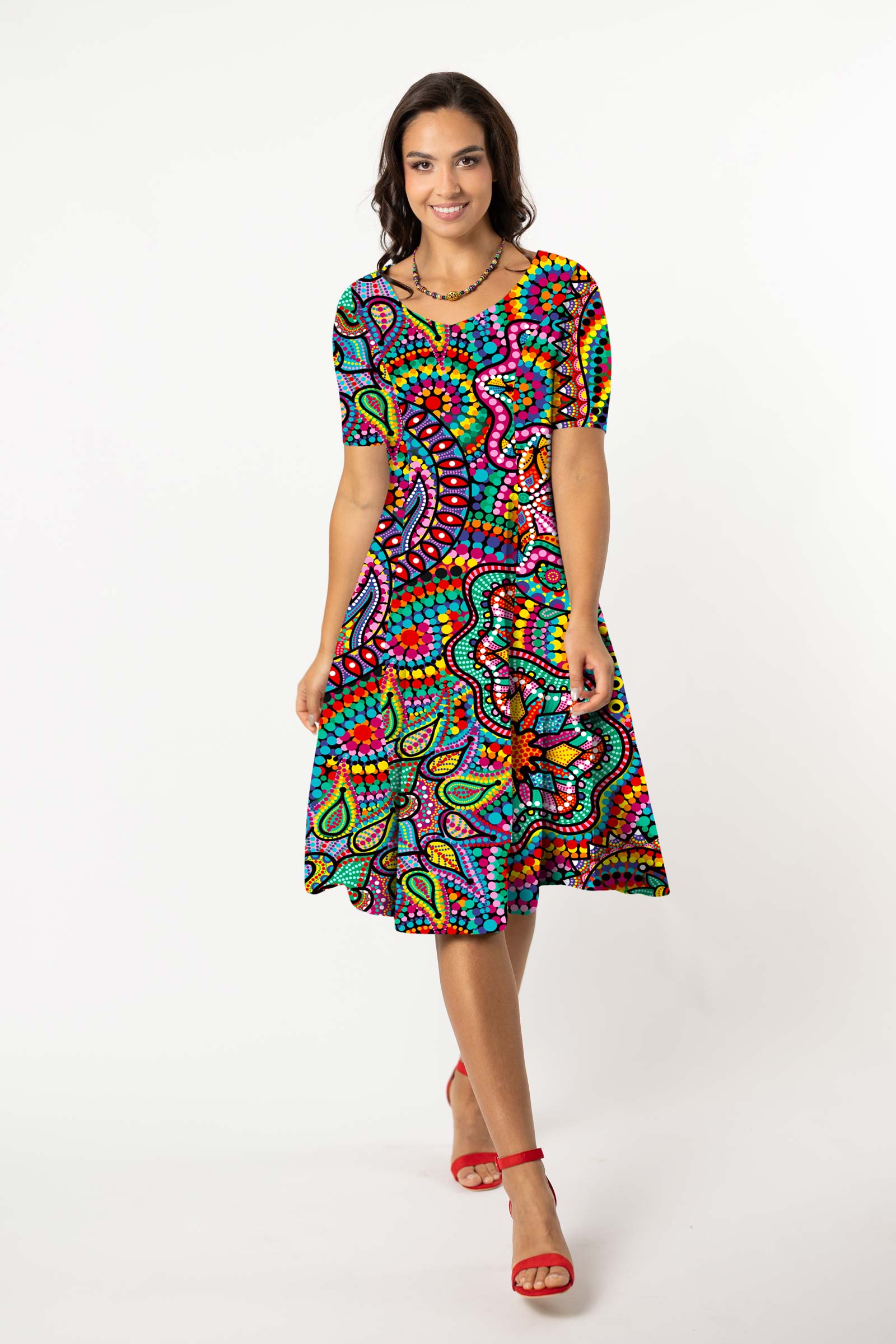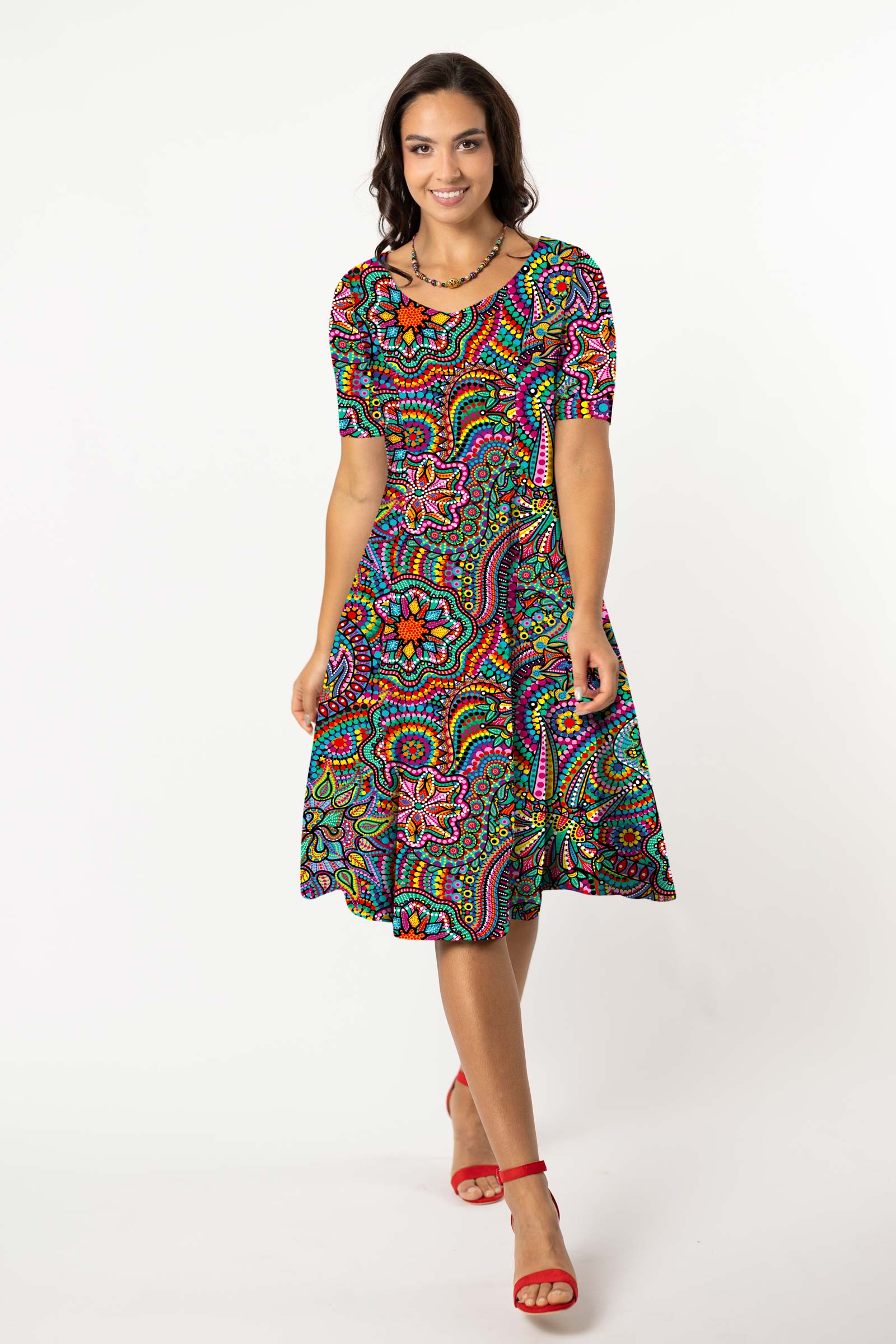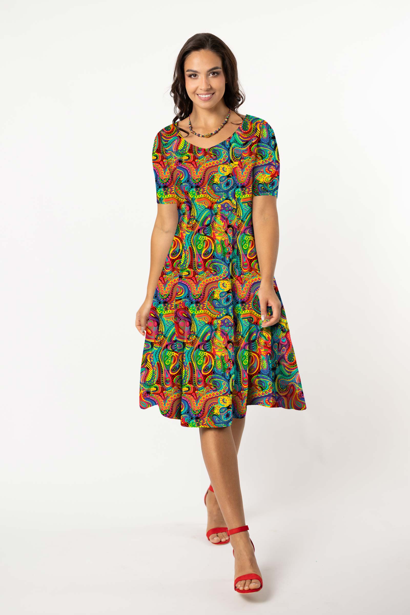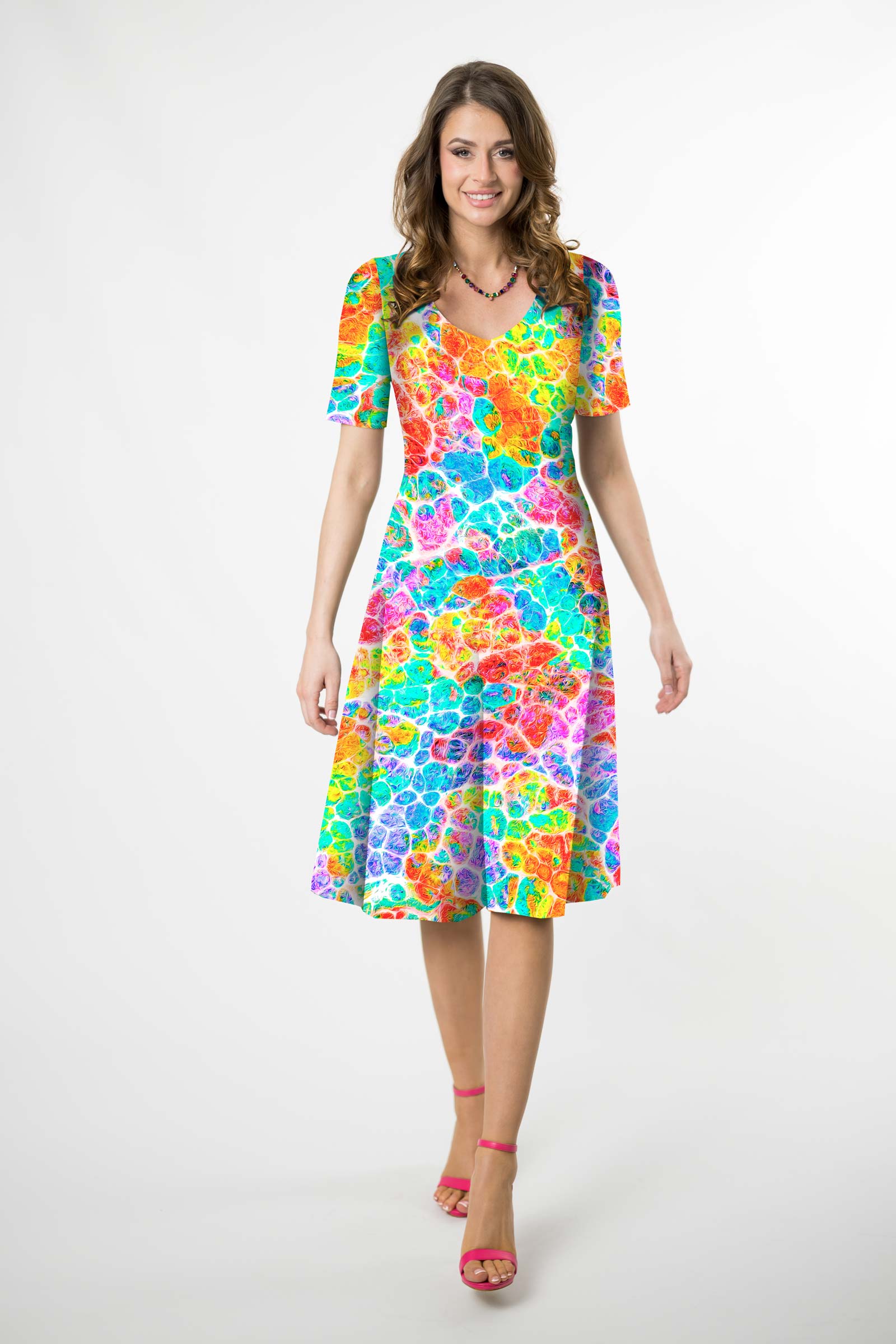 Sukienka midi rozkloszowana V krótki rękaw - WZÓR DO WYBORU