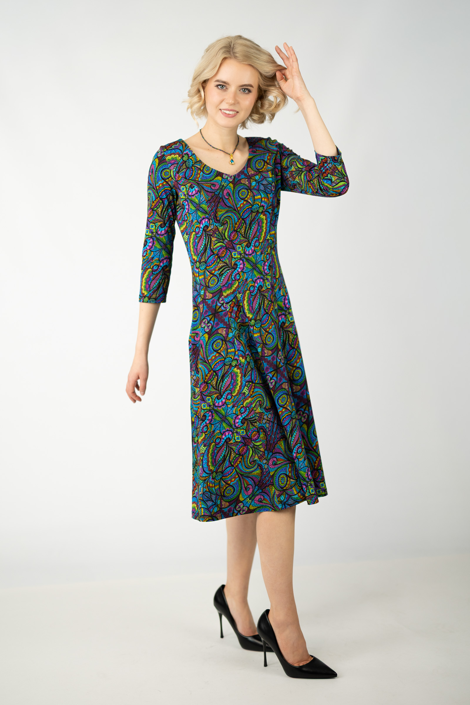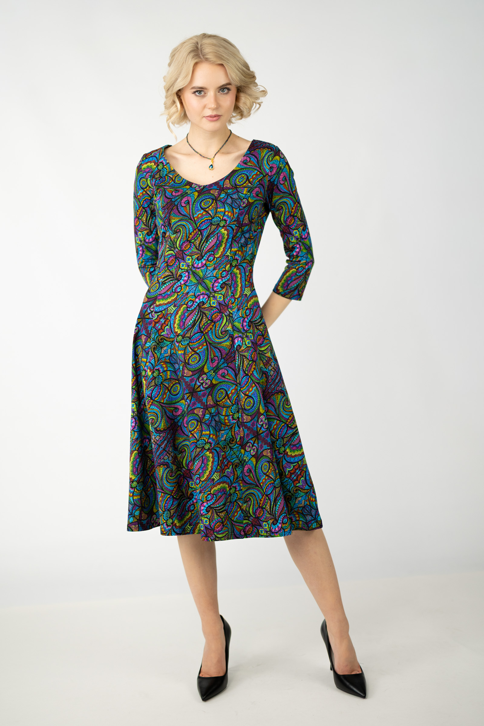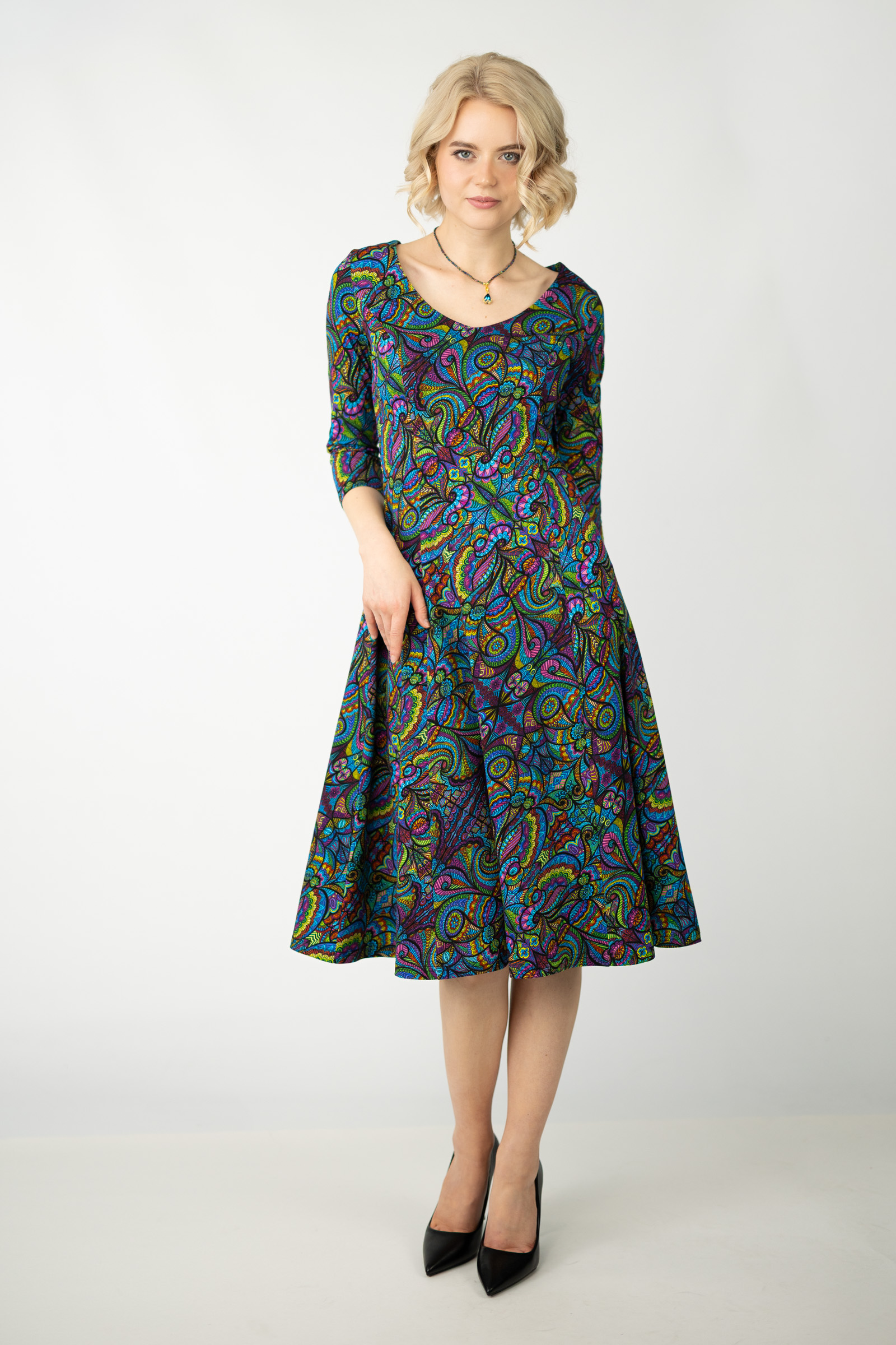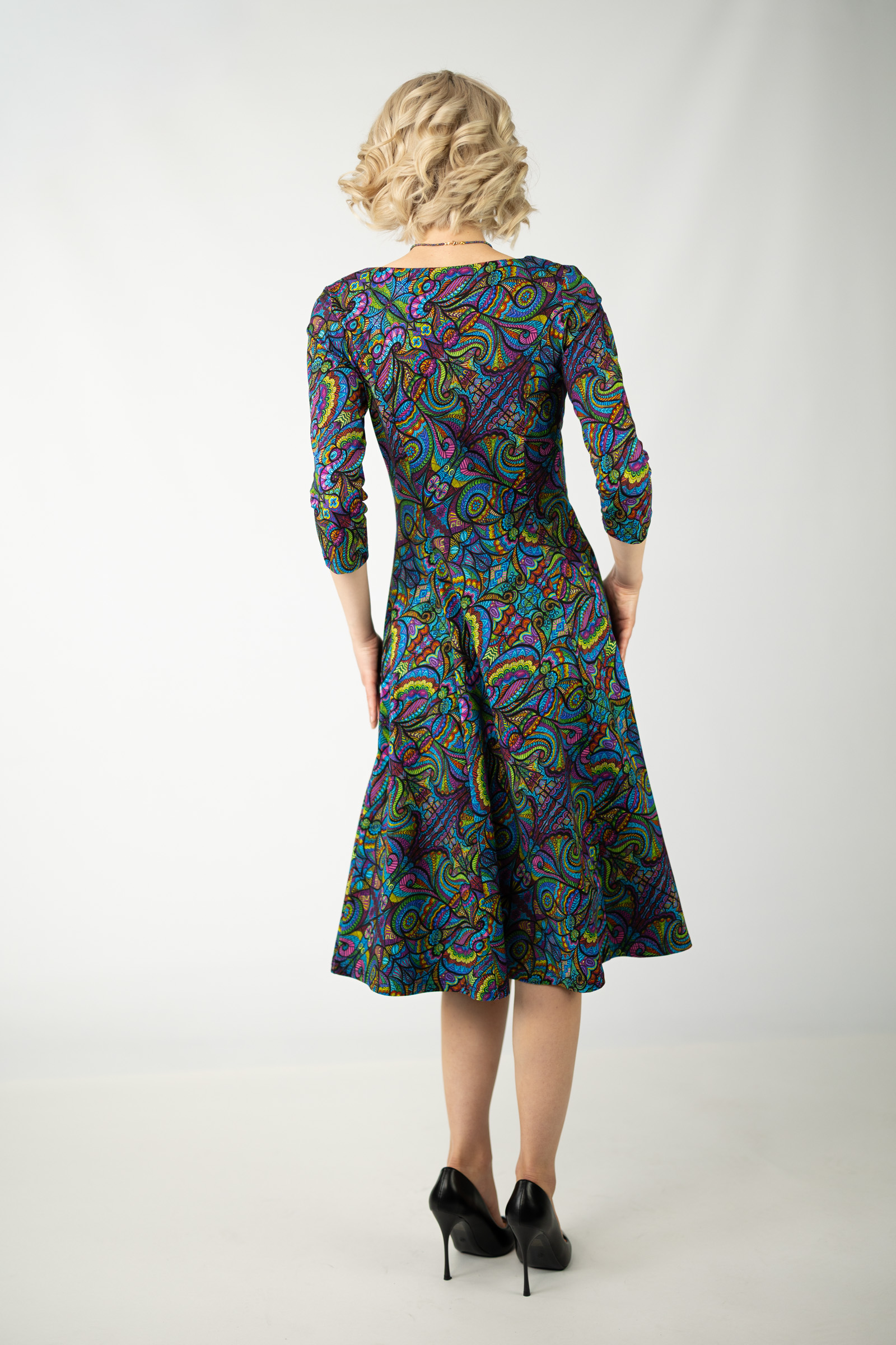 Najbardziej wyjątkowym elementem sukienki jest autorski wzór zaprojektowany przez właścicielkę i twórczynię marki, Katarzynę Gałaj. To unikalny wzór, dostępny tylko u nas, który nadaje sukience niepowtarzalnego charakteru.