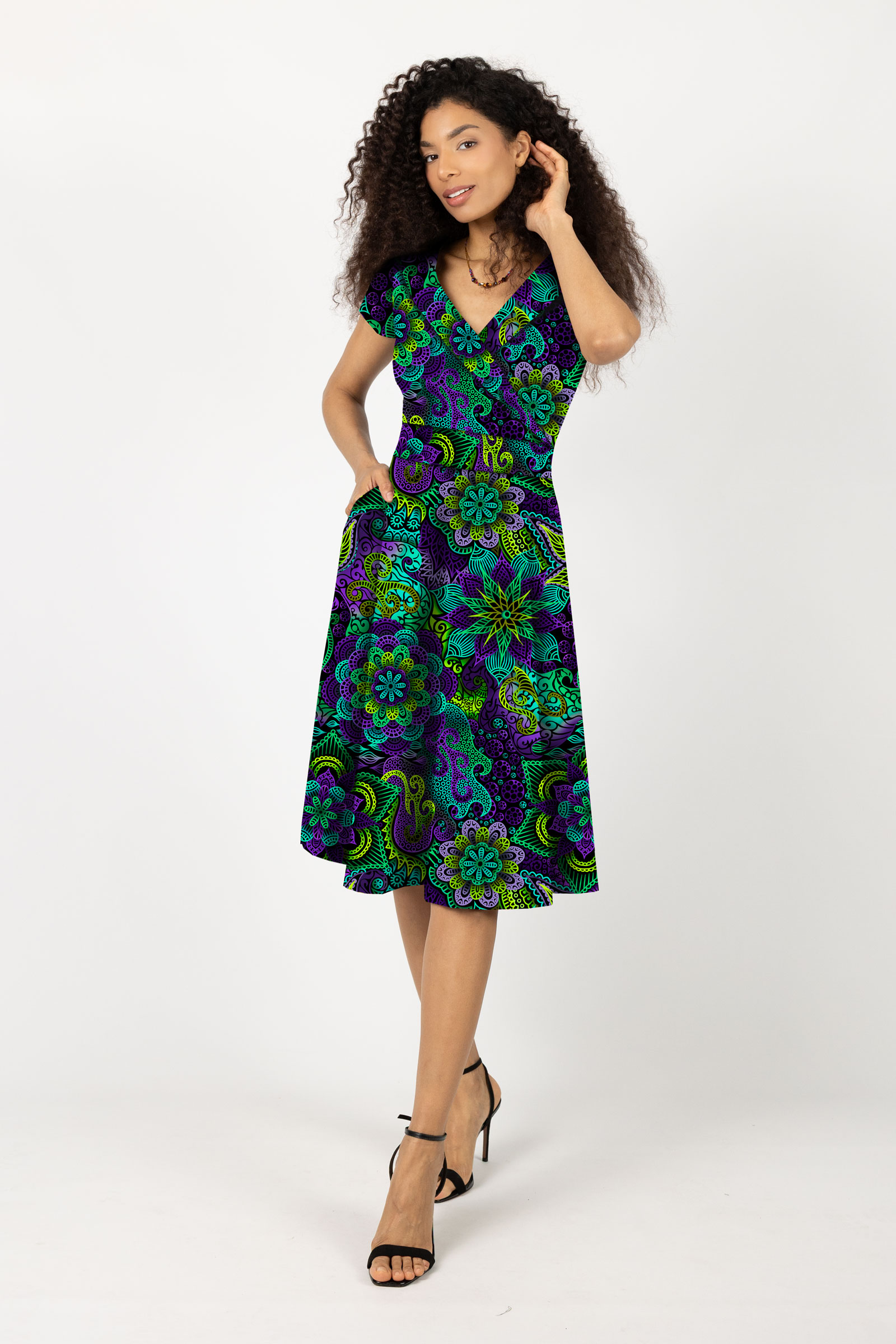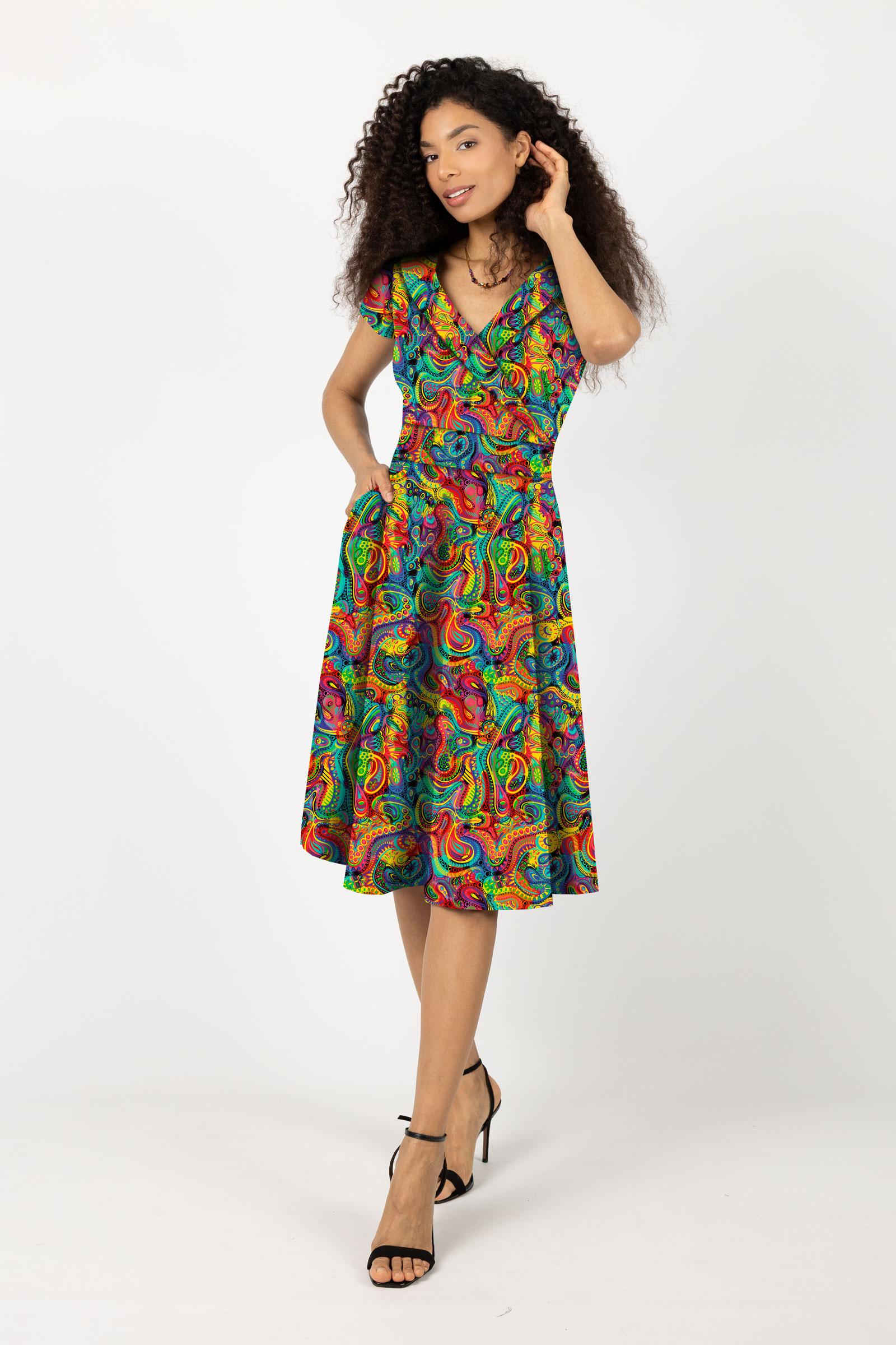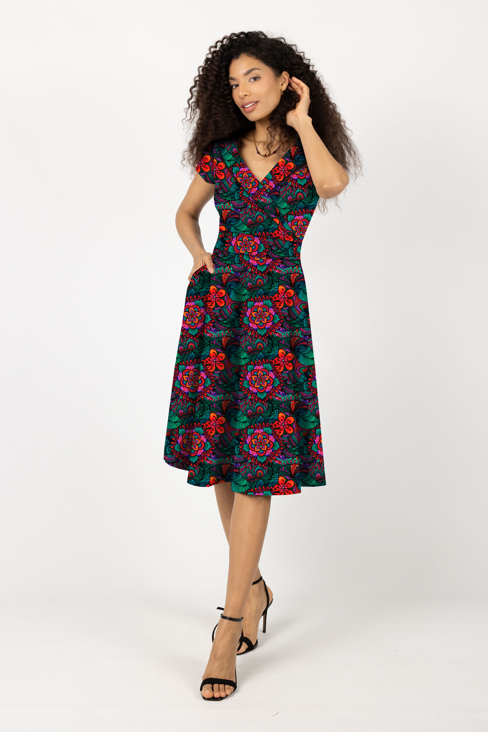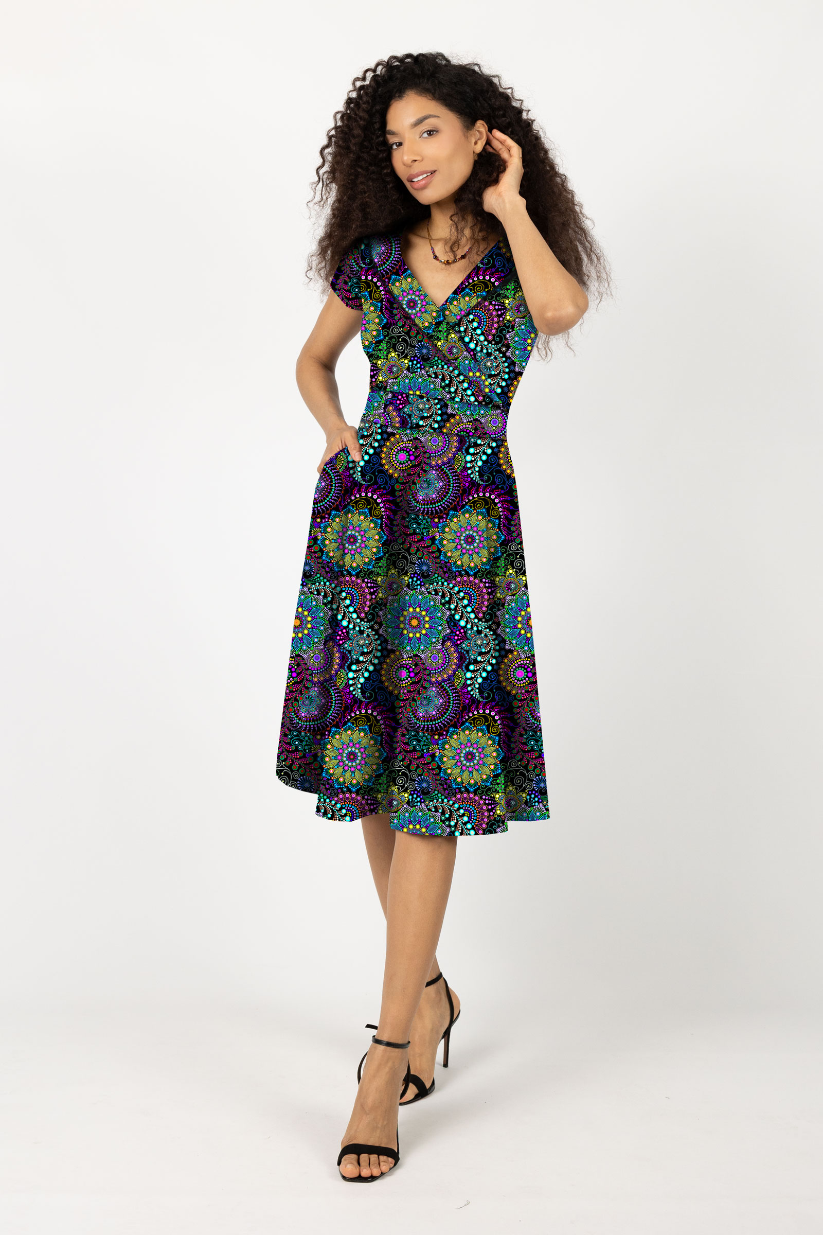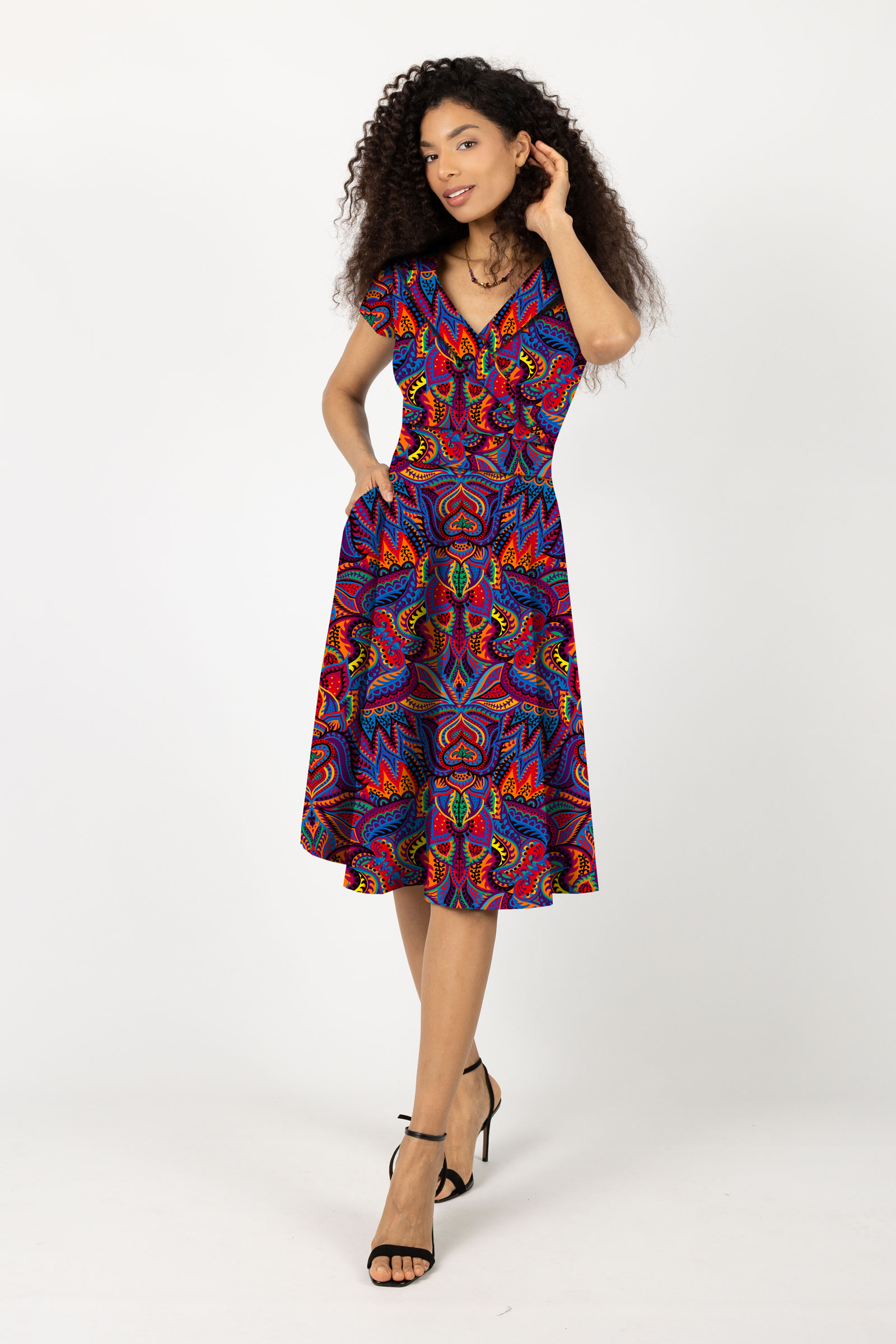 Autorski wzór przyciąga uwagę, a rozkloszowany dół nadaje sukience lekkości i pięknie pracuje w ruchu. W bocznych szwach ukryte kieszenie — praktyczny detal, który nie zaburza formy.