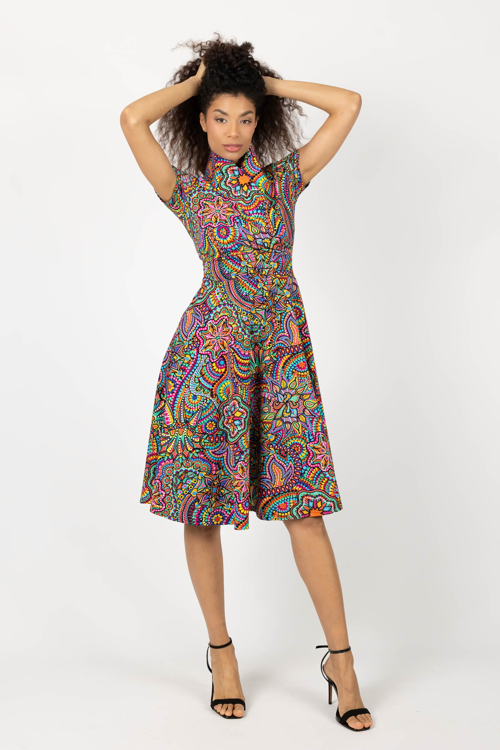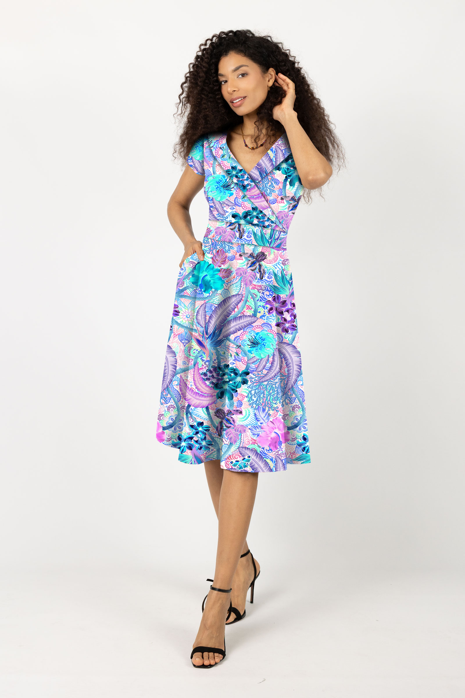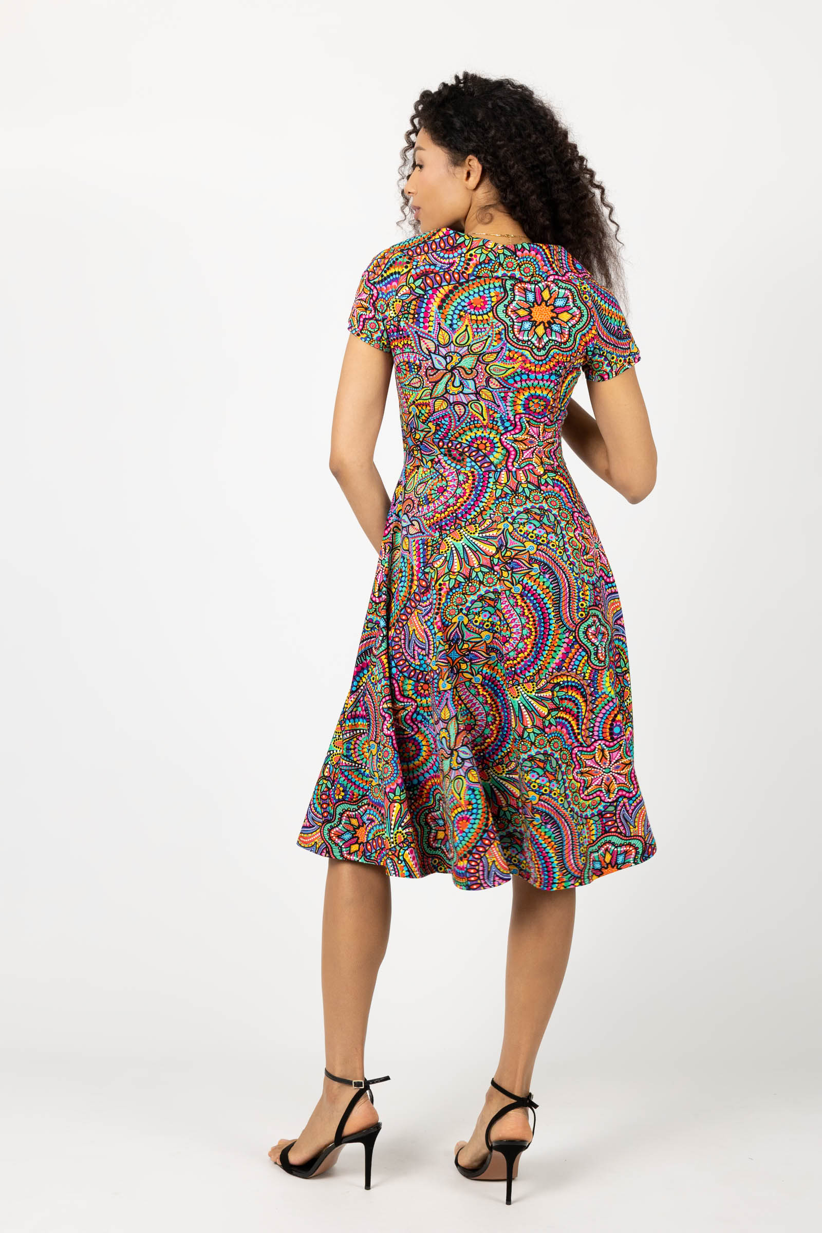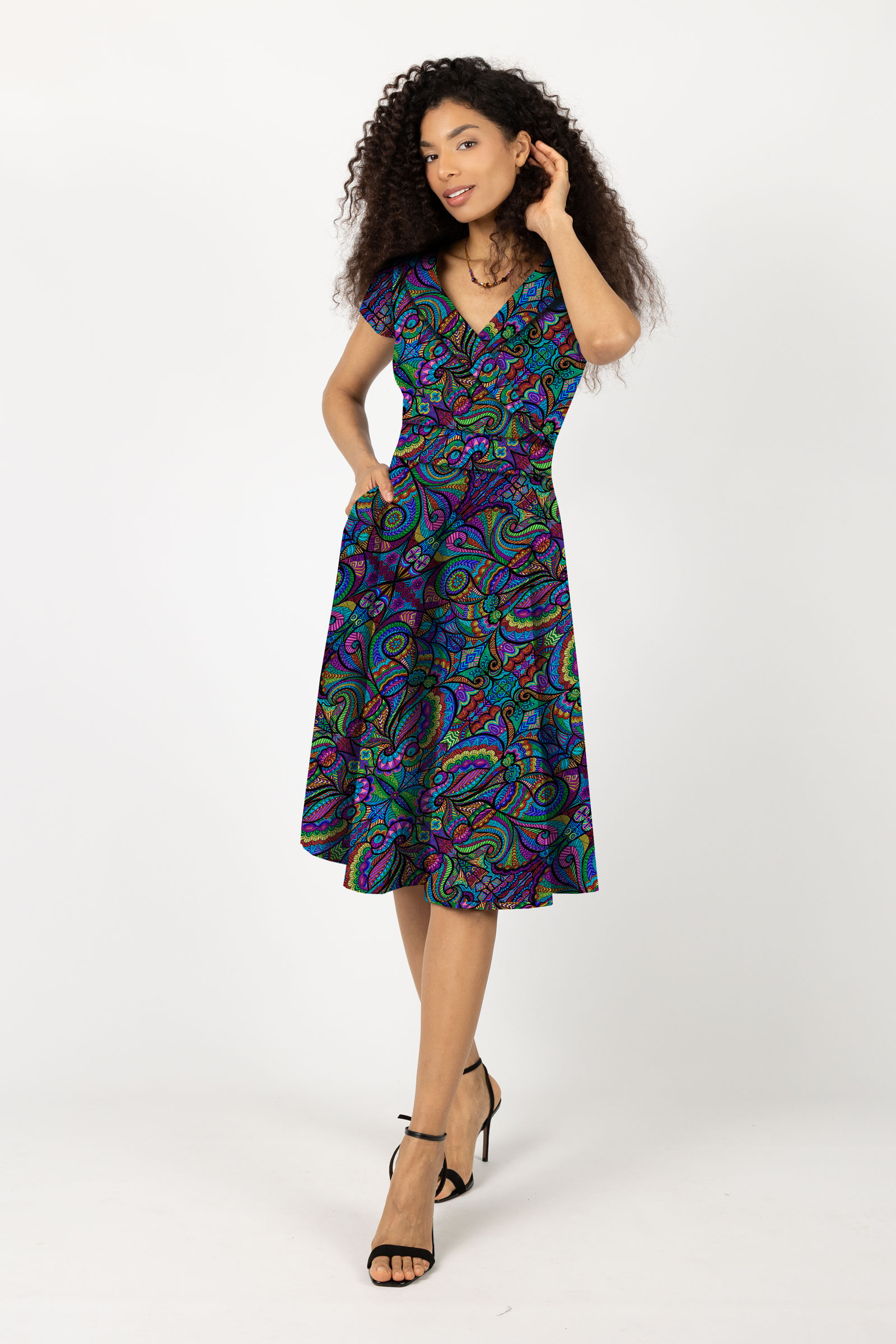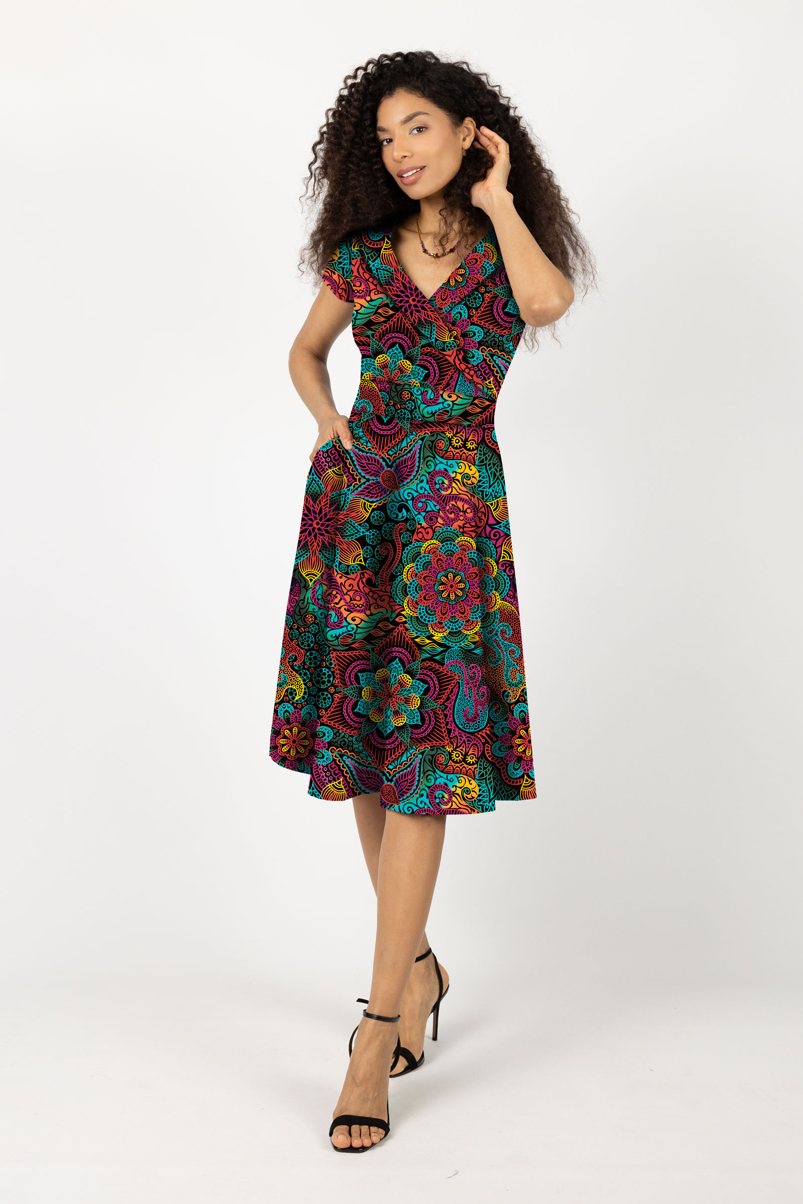 Autorski wzór przyciąga uwagę, a rozkloszowany dół nadaje sukience lekkości i pięknie pracuje w ruchu. W bocznych szwach ukryte kieszenie — praktyczny detal, który nie zaburza formy.