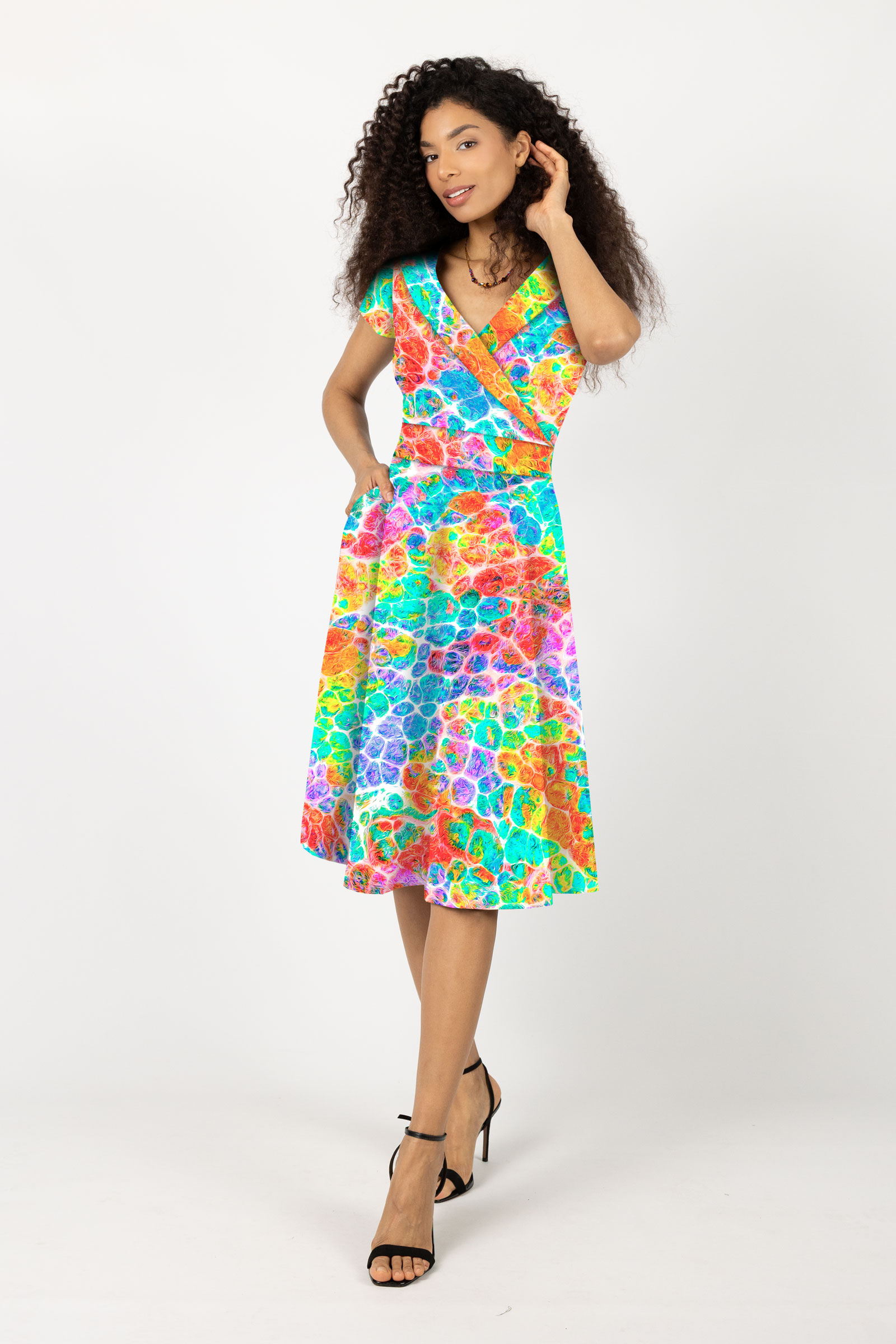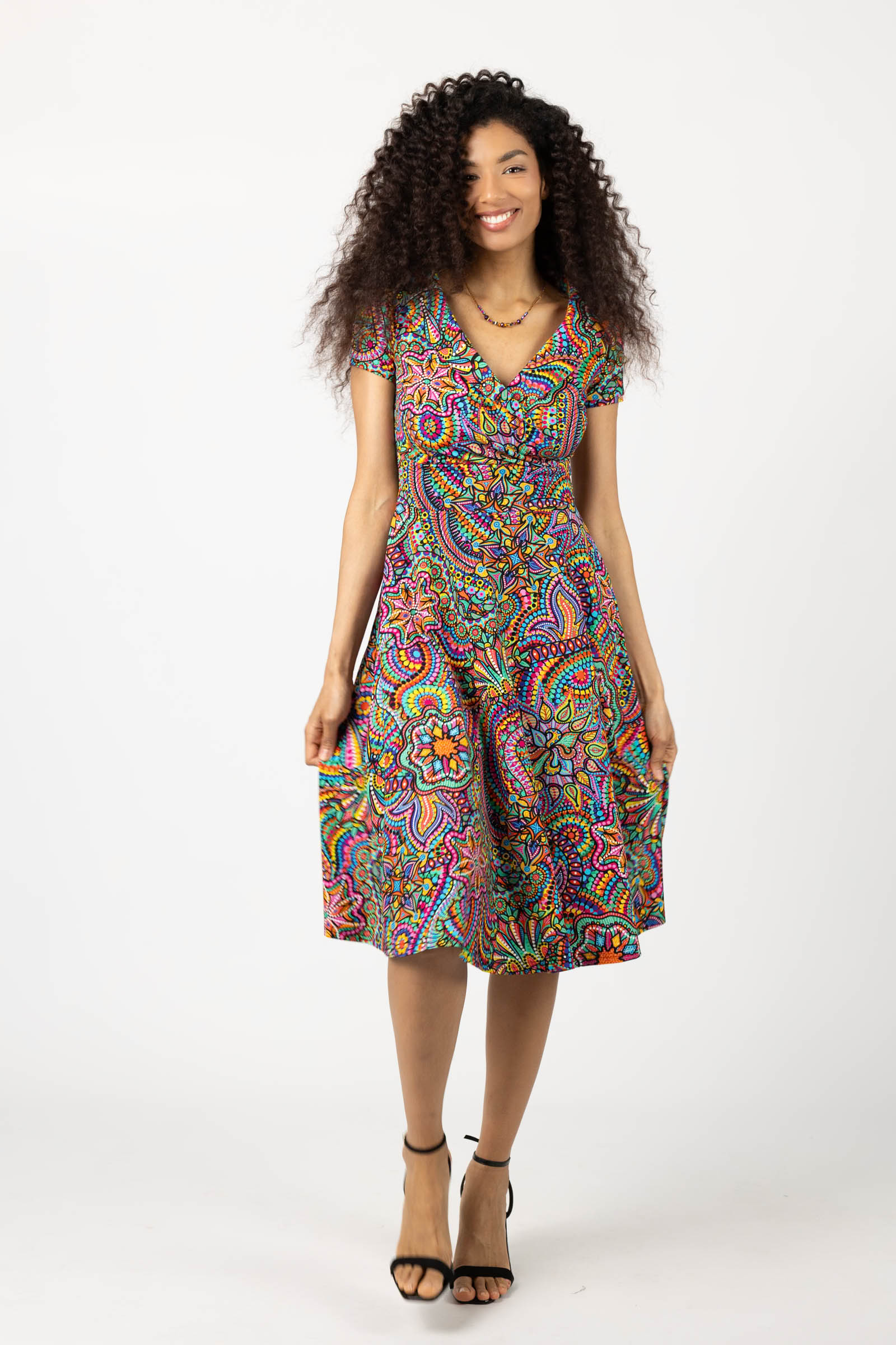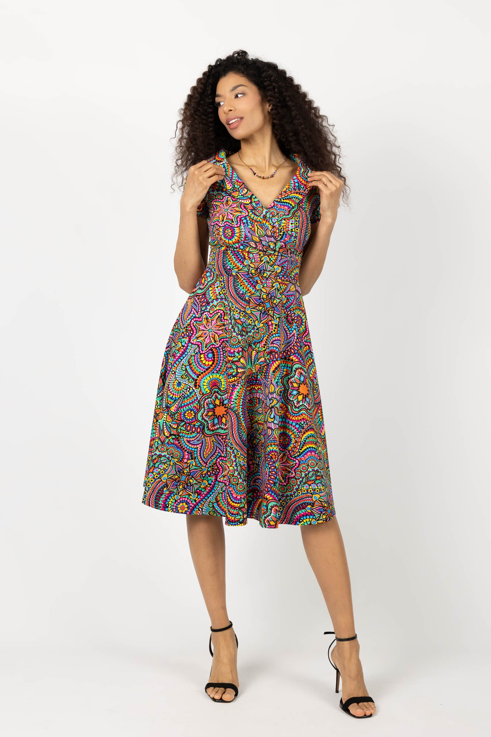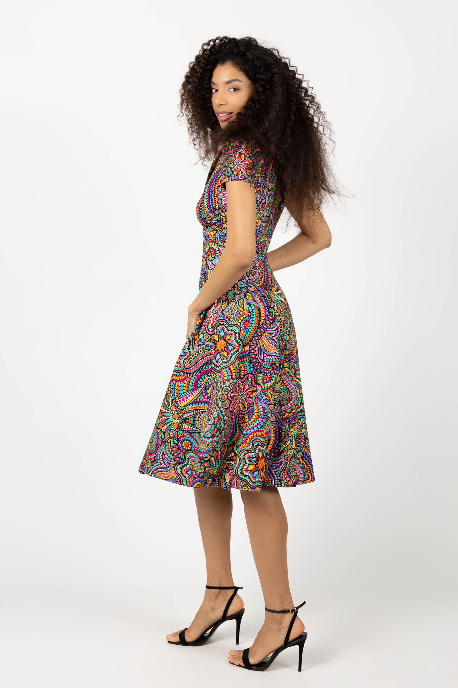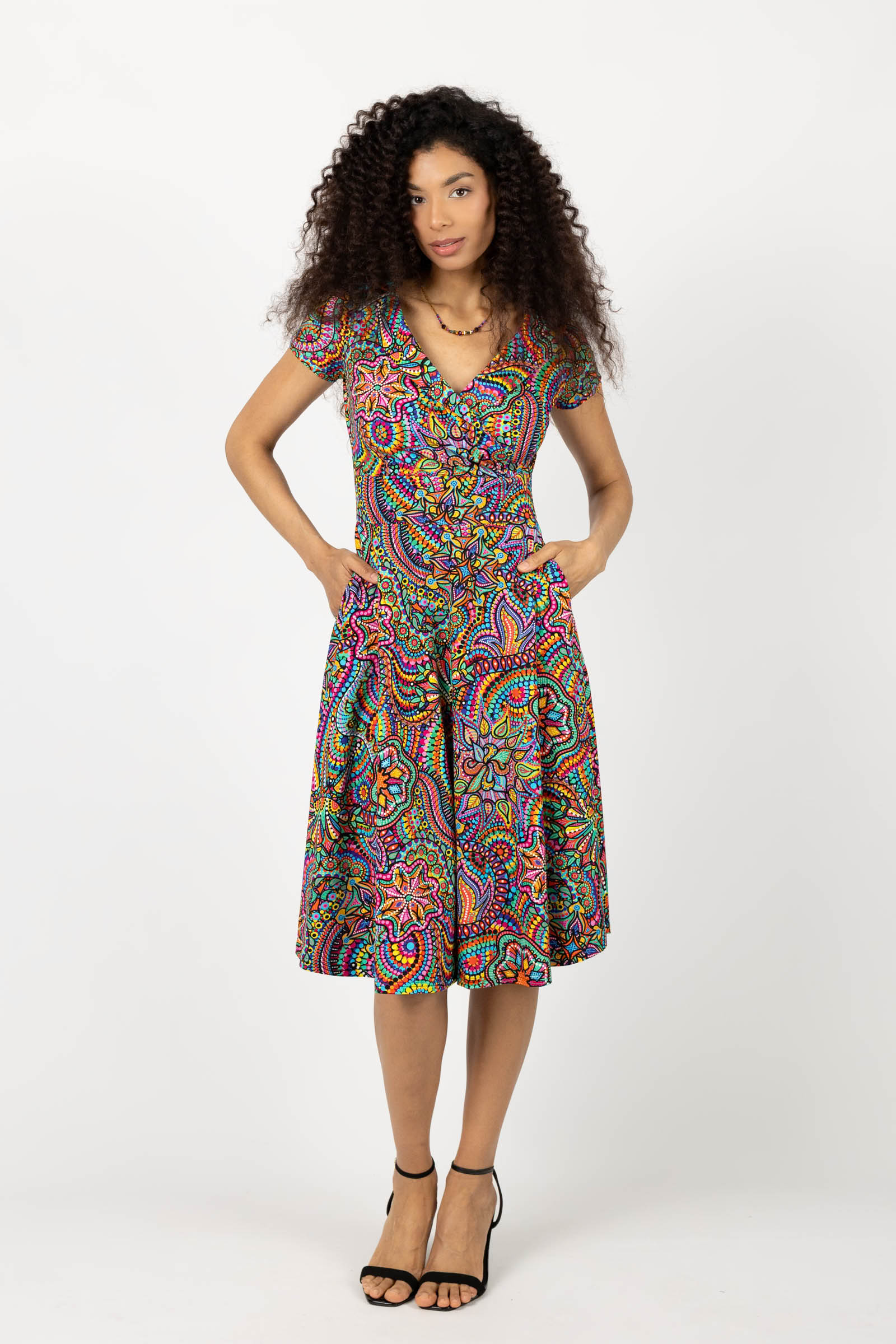 Autorski wzór przyciąga uwagę, a rozkloszowany dół nadaje sukience lekkości i pięknie pracuje w ruchu. W bocznych szwach ukryte kieszenie — praktyczny detal, który nie zaburza formy.