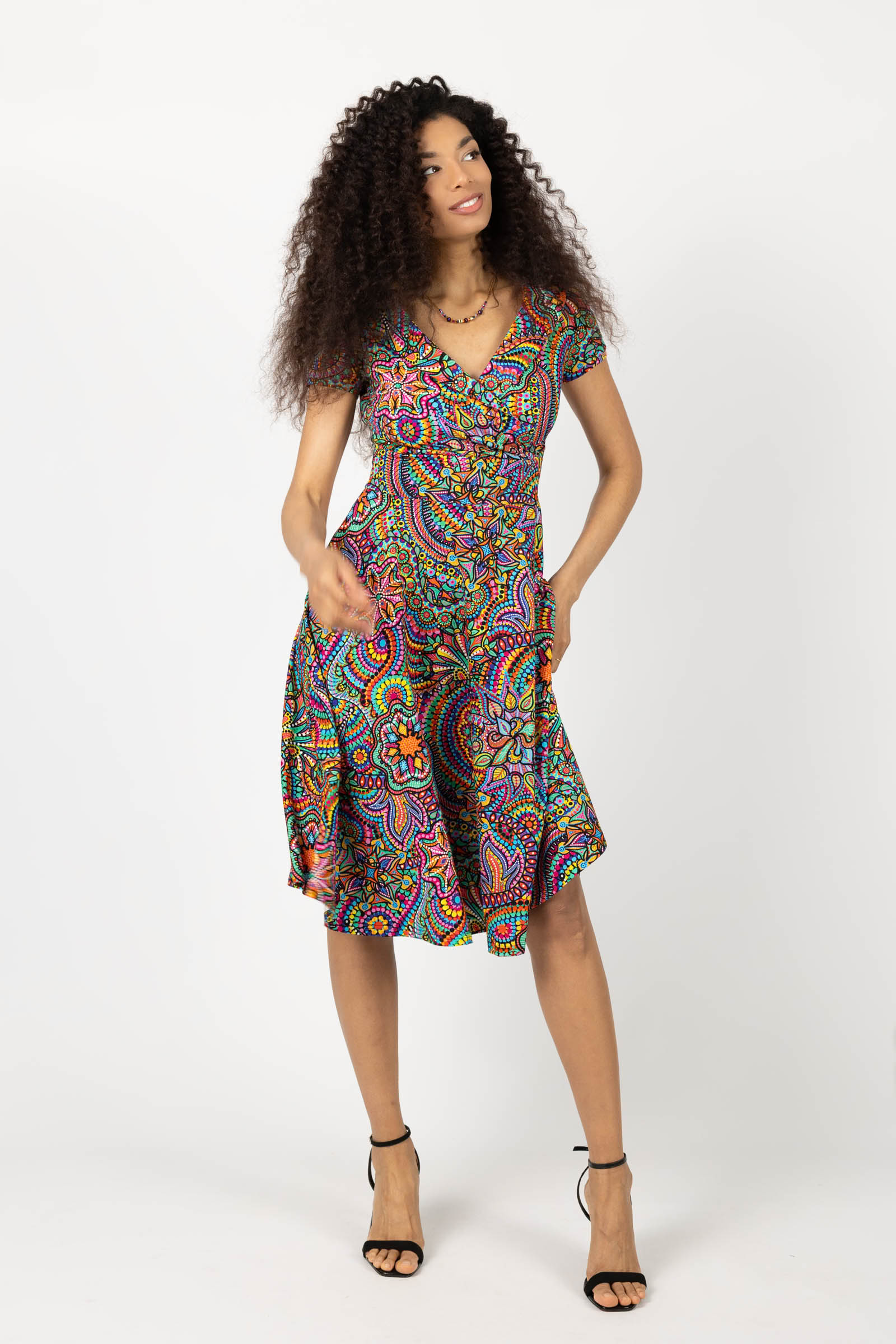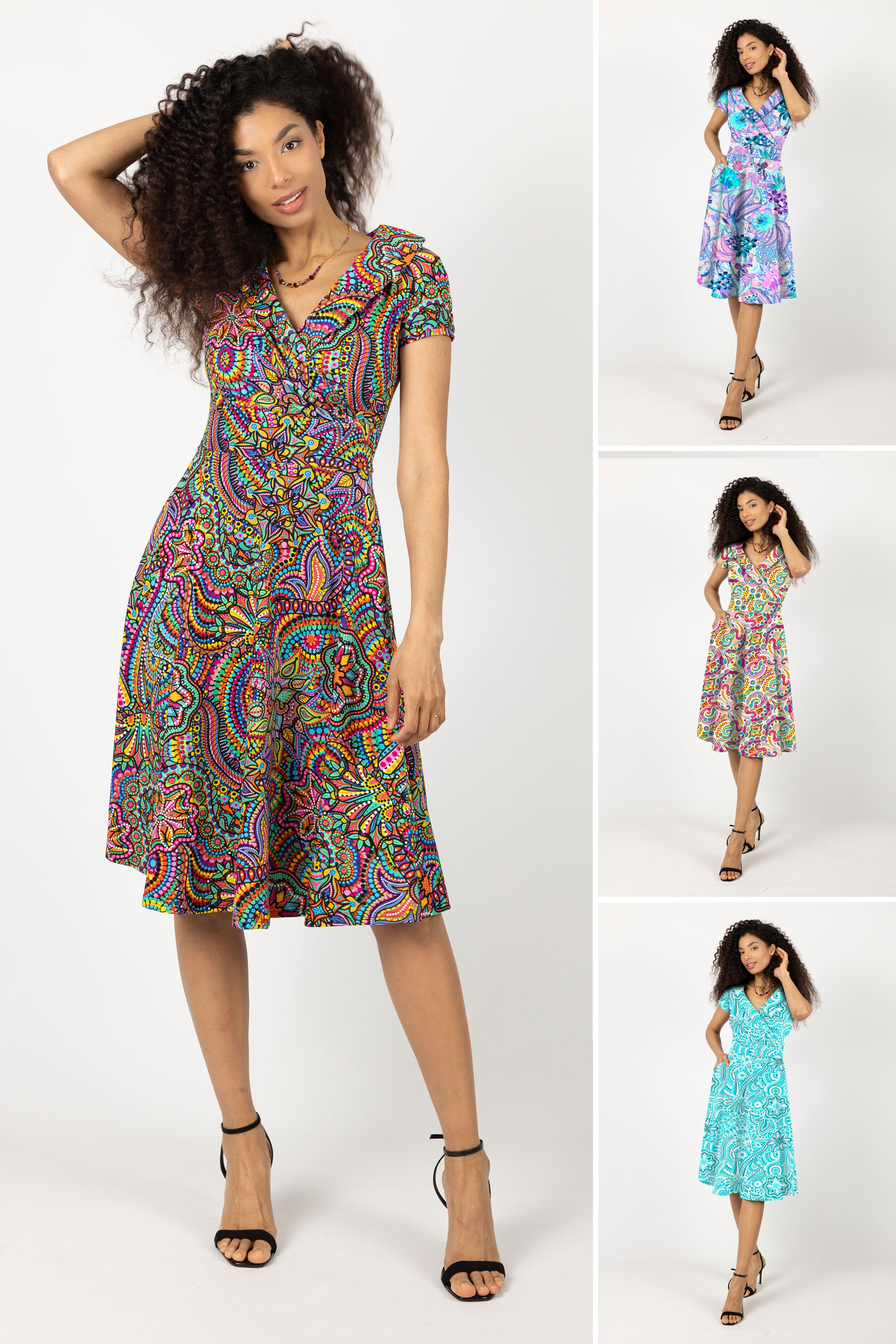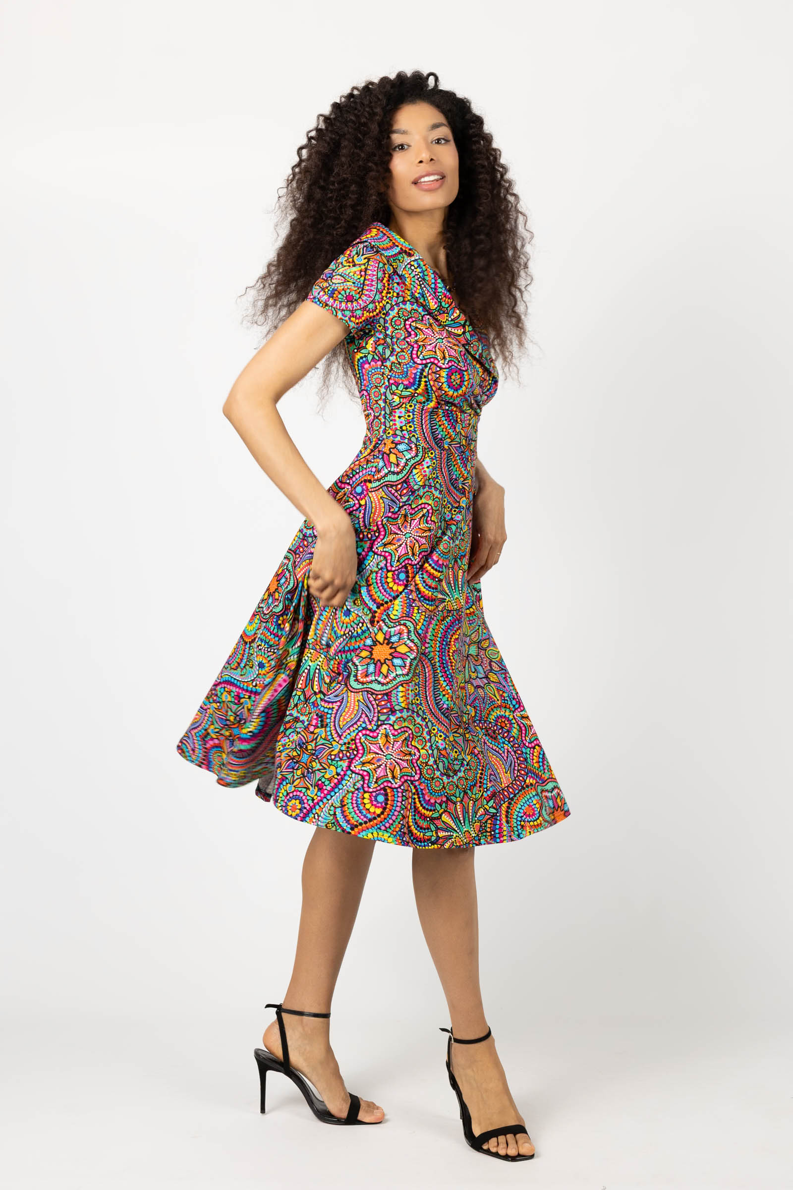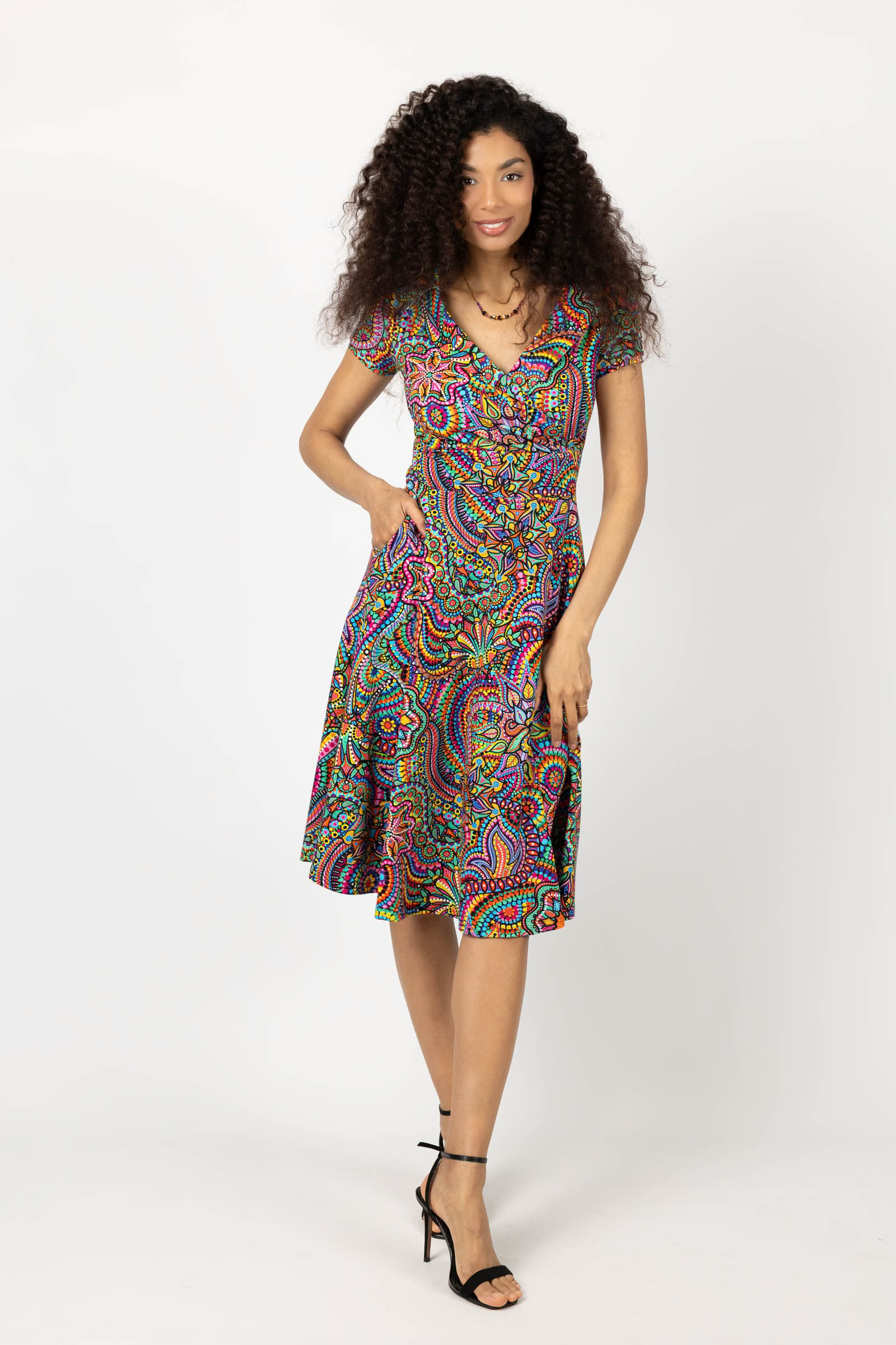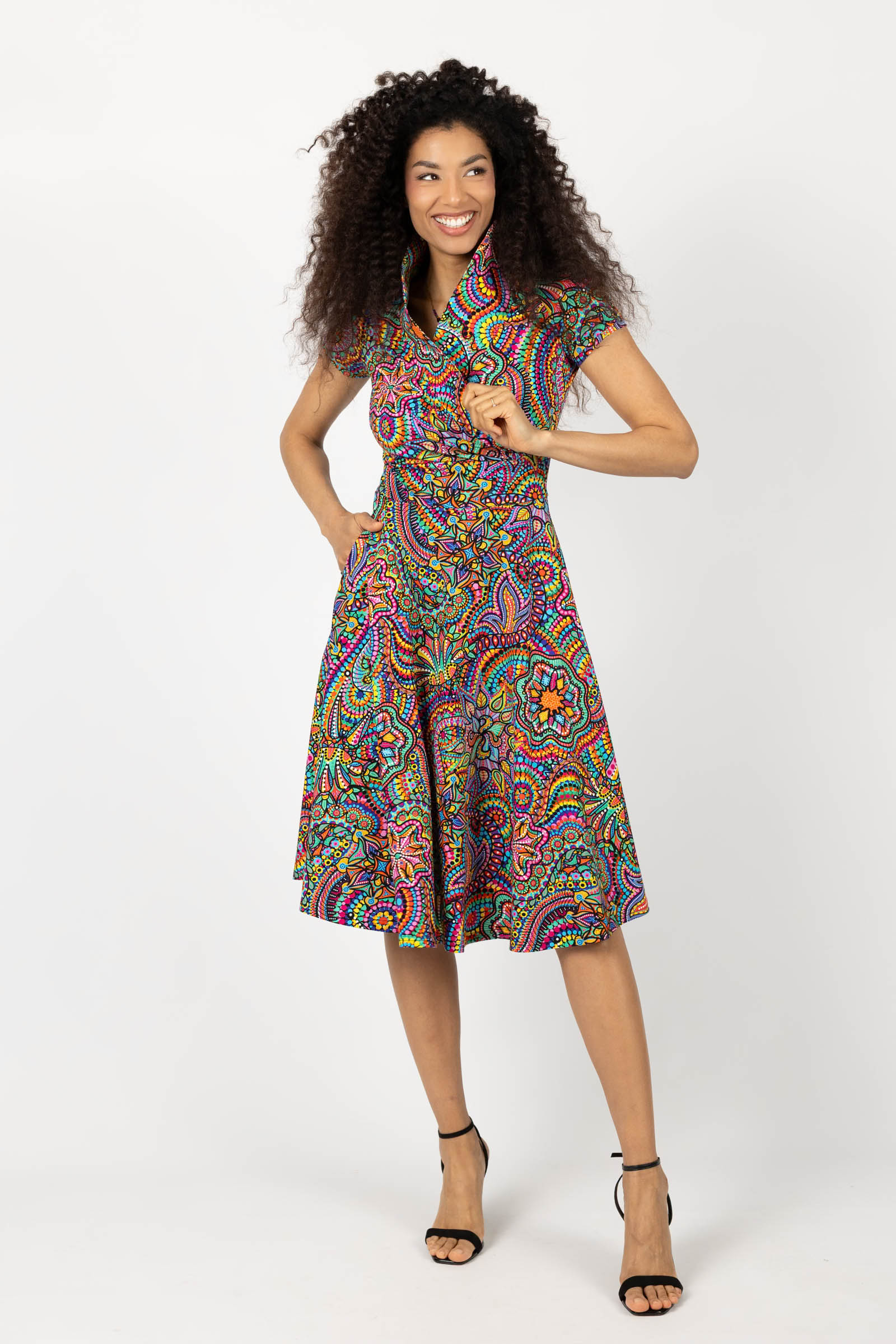 Autorski wzór przyciąga uwagę, a rozkloszowany dół nadaje sukience lekkości i pięknie pracuje w ruchu. W bocznych szwach ukryte kieszenie — praktyczny detal, który nie zaburza formy.