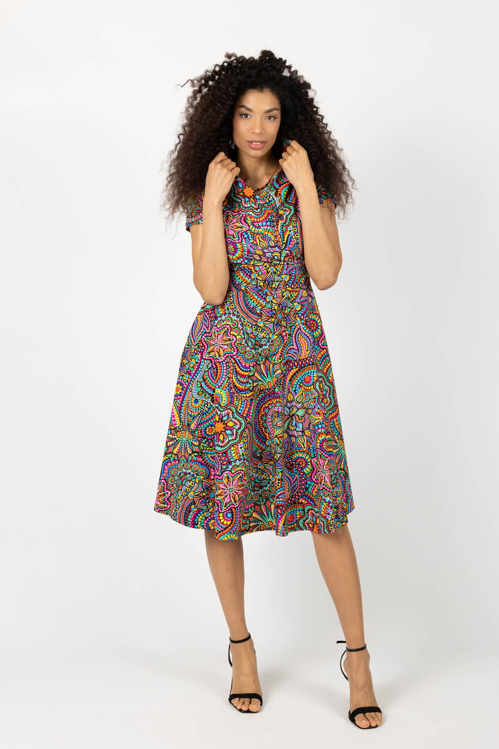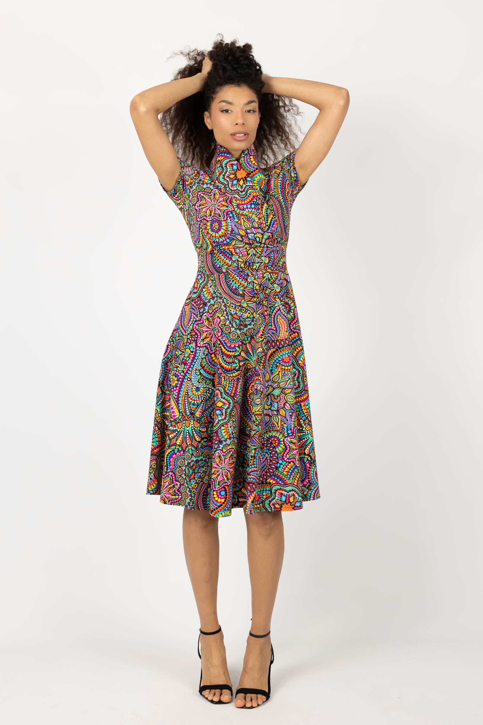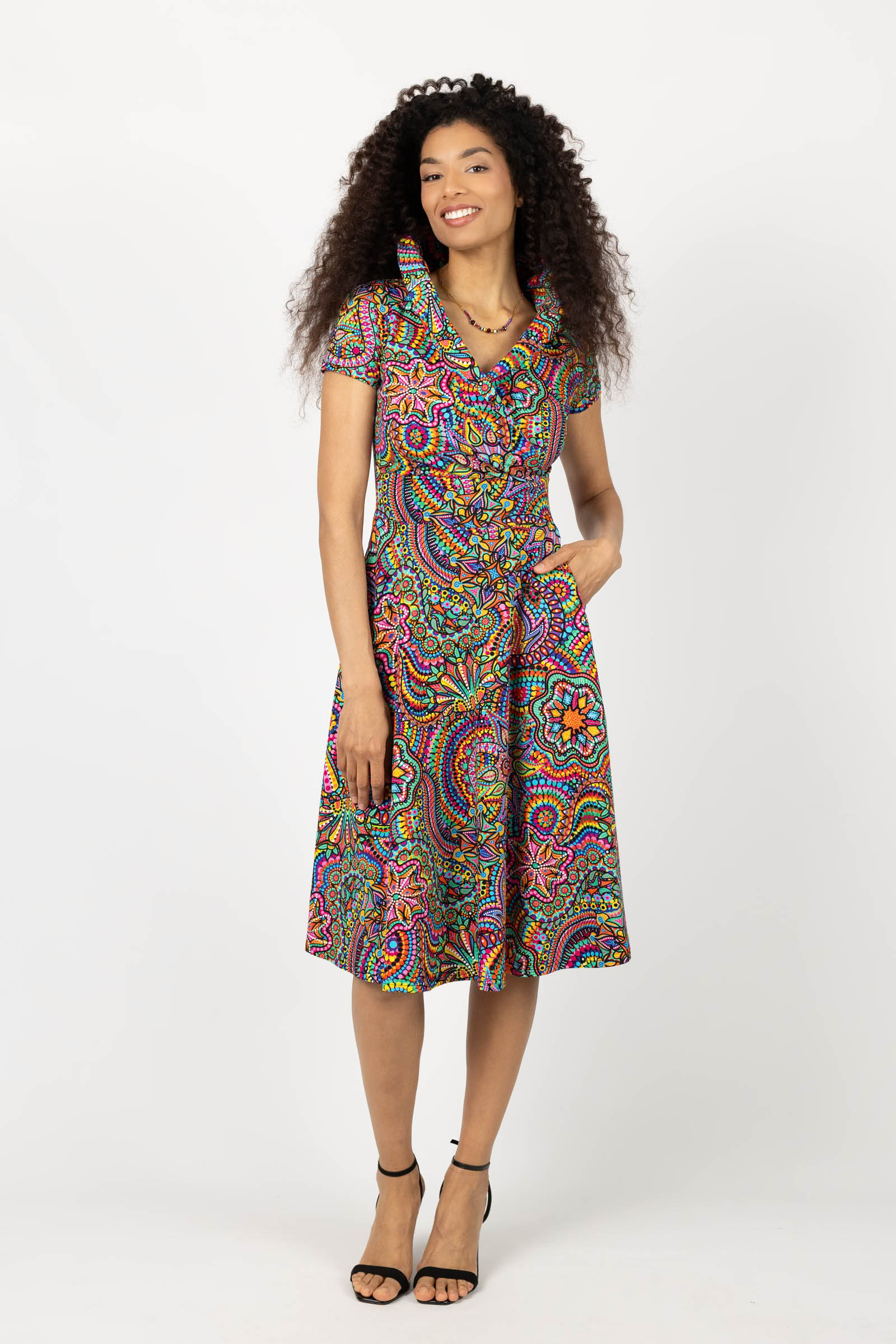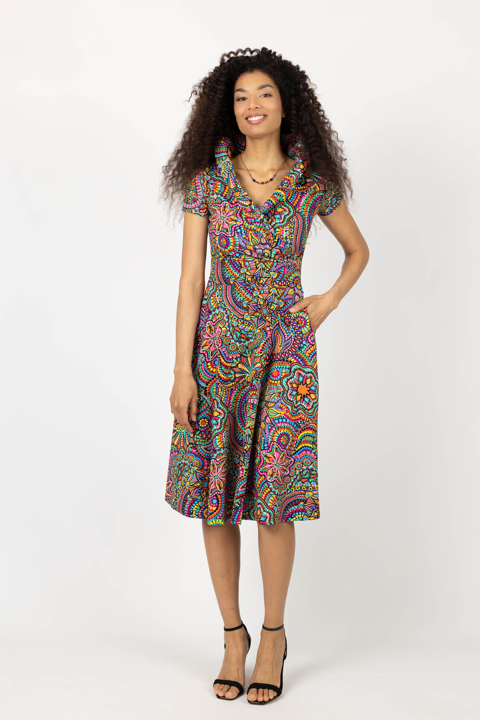 Sukienka midi z kołnierzem, krótki rękaw "CONFETTI" i inne wzory