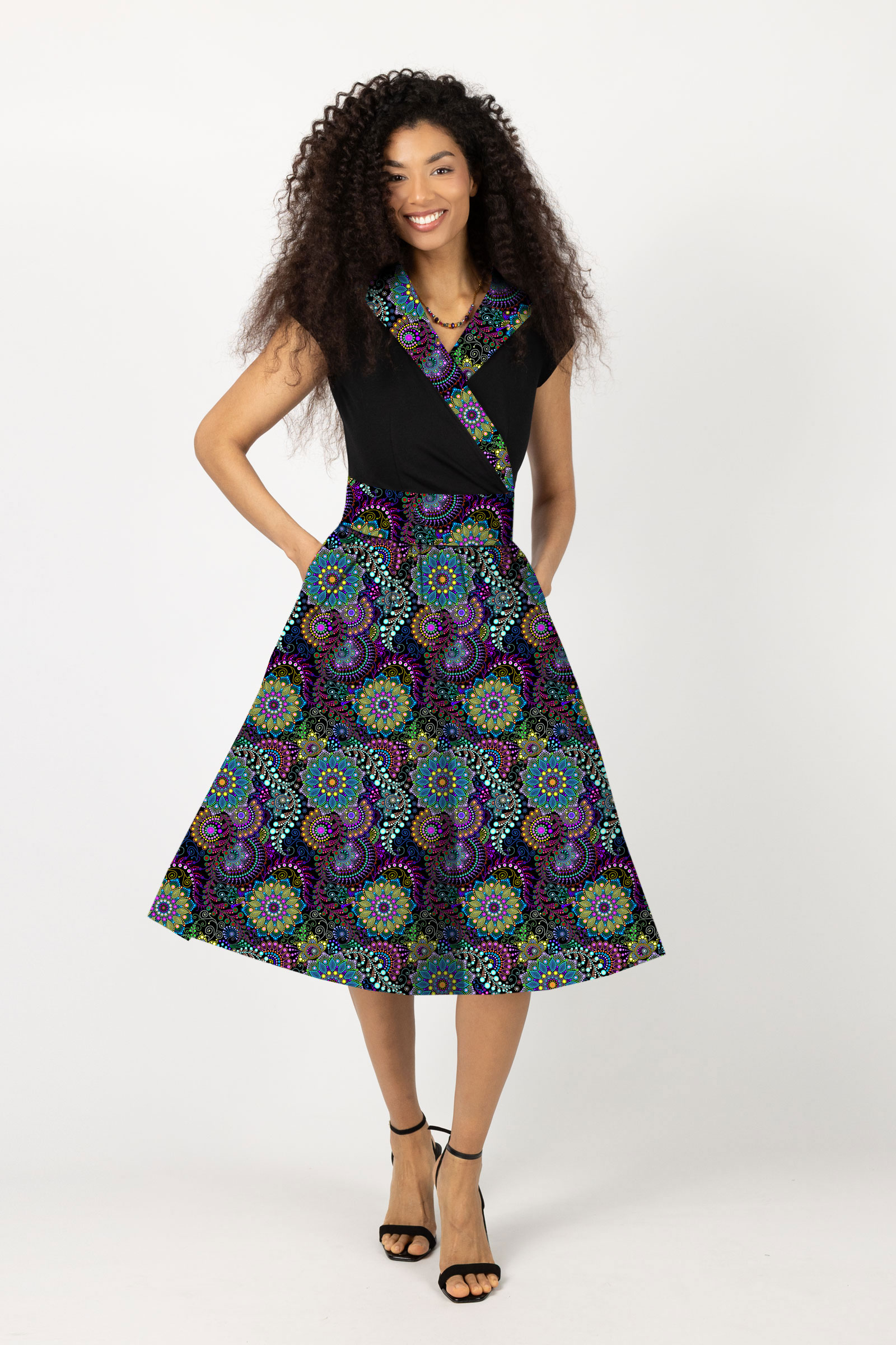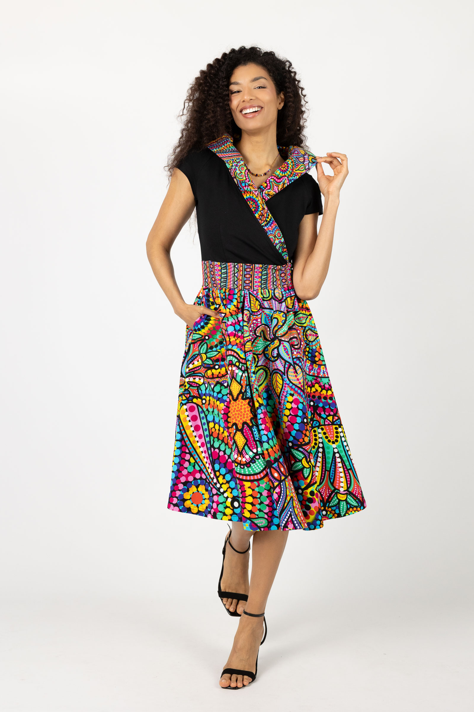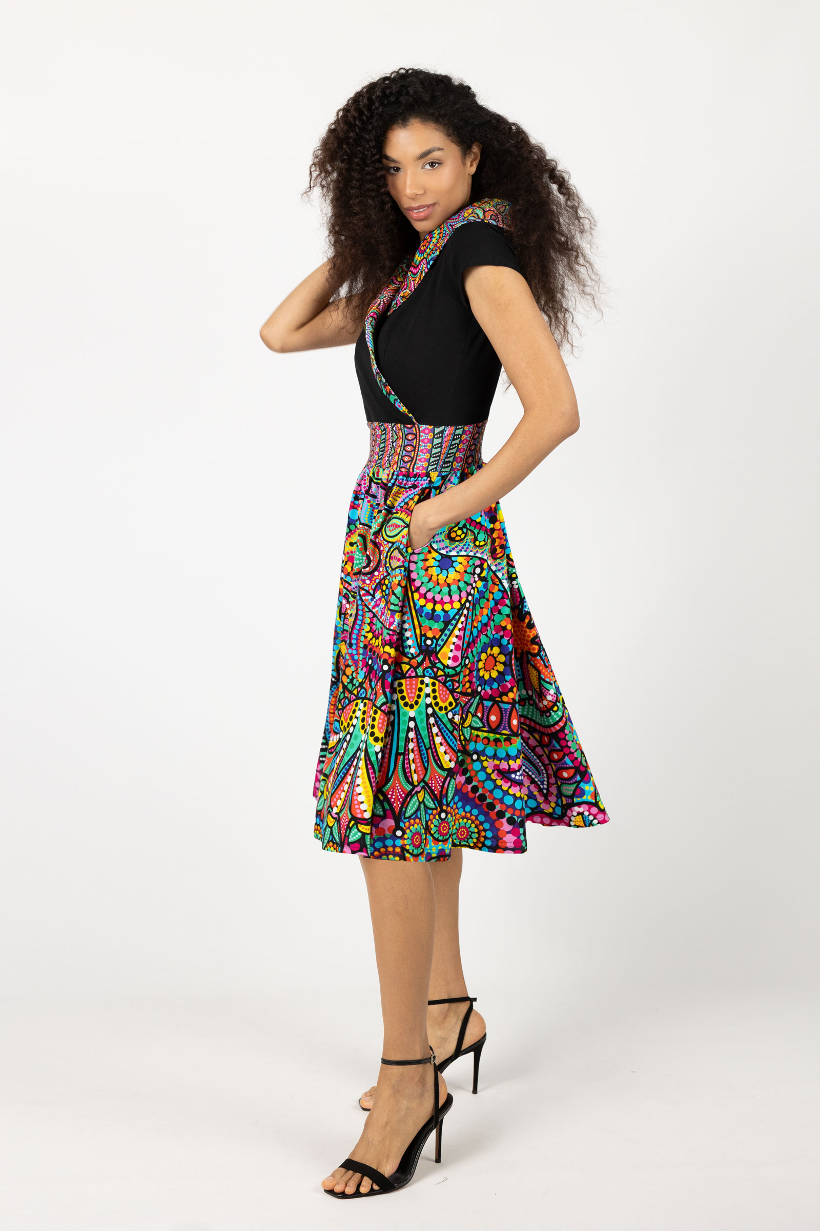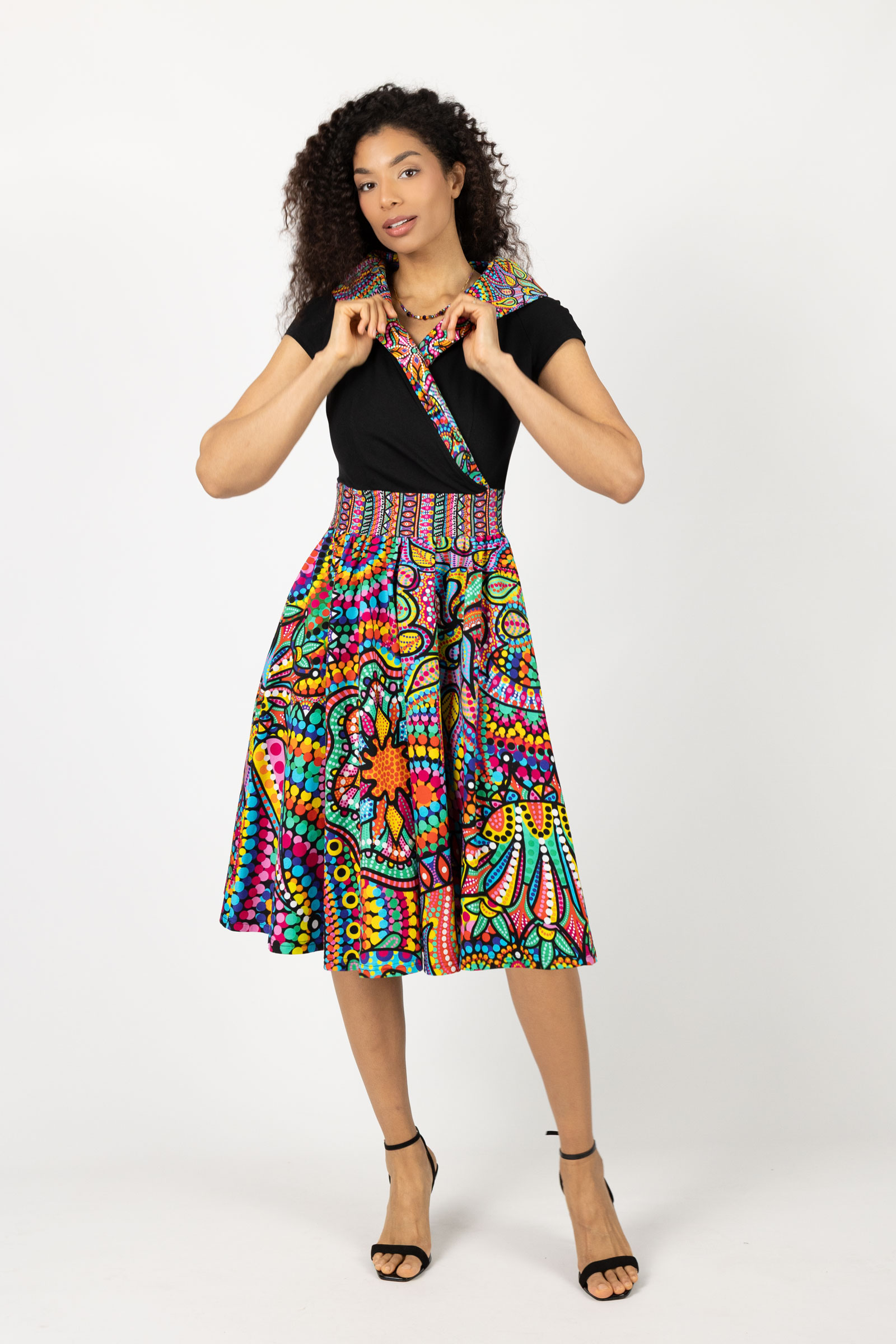 Sukienka midi z kołnierzem, krótki rękaw z czarną górą "CONFETTI" mix i inne wzory