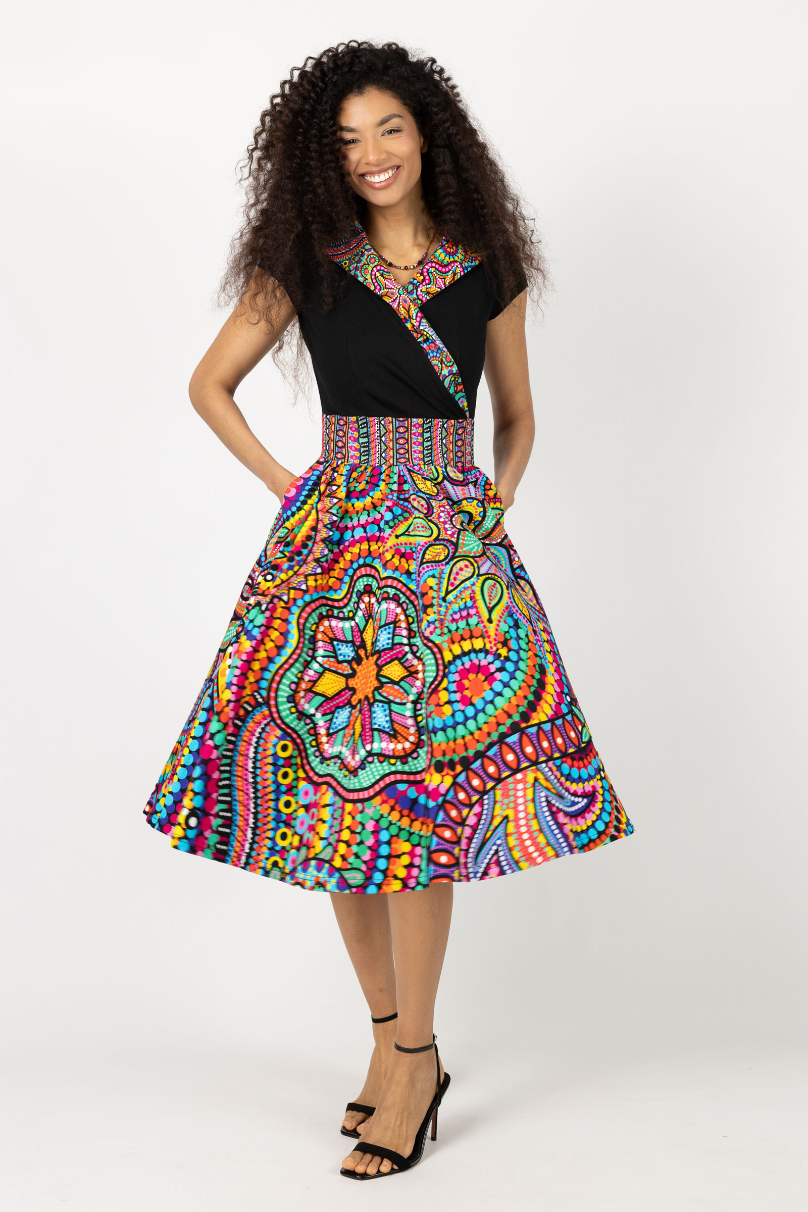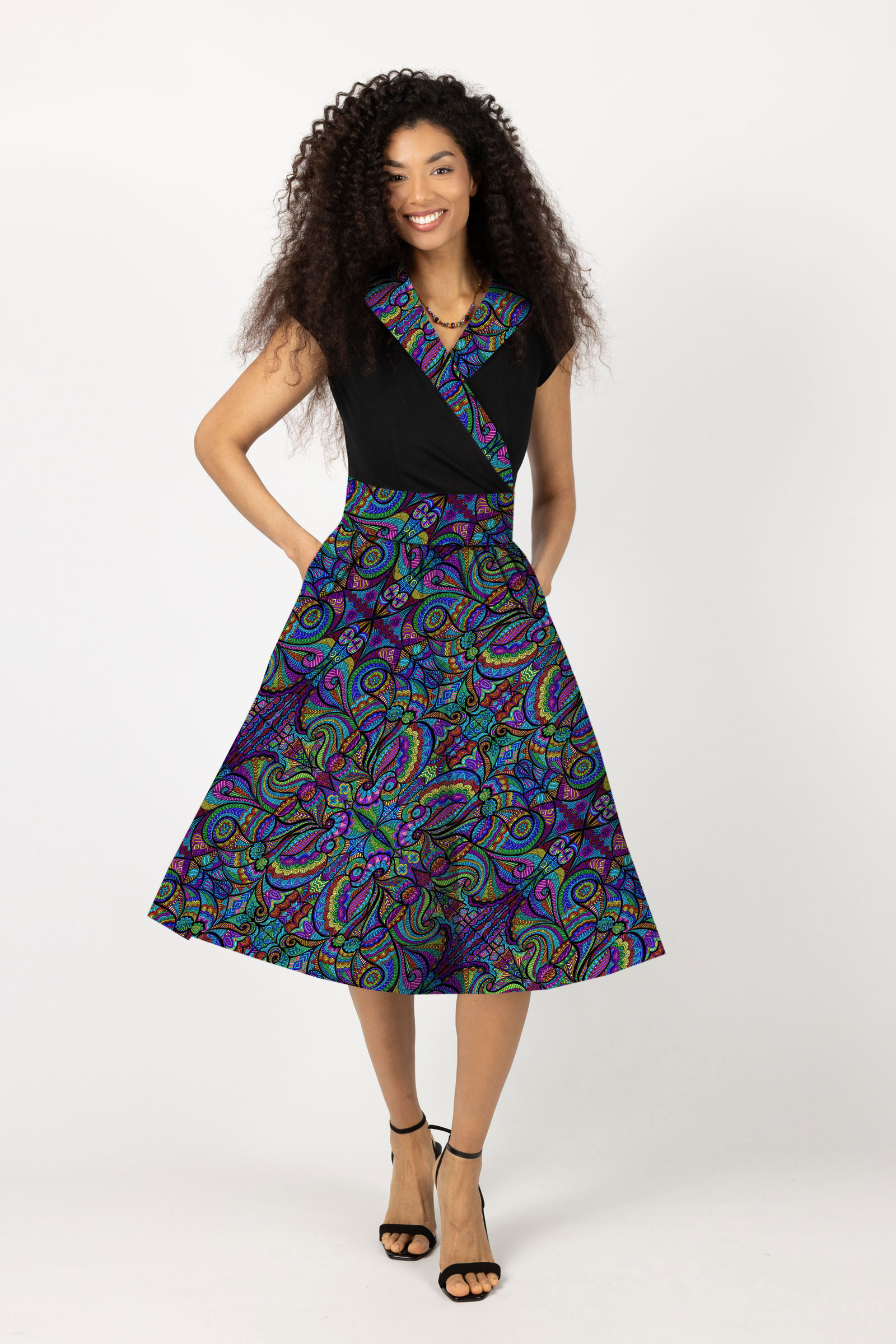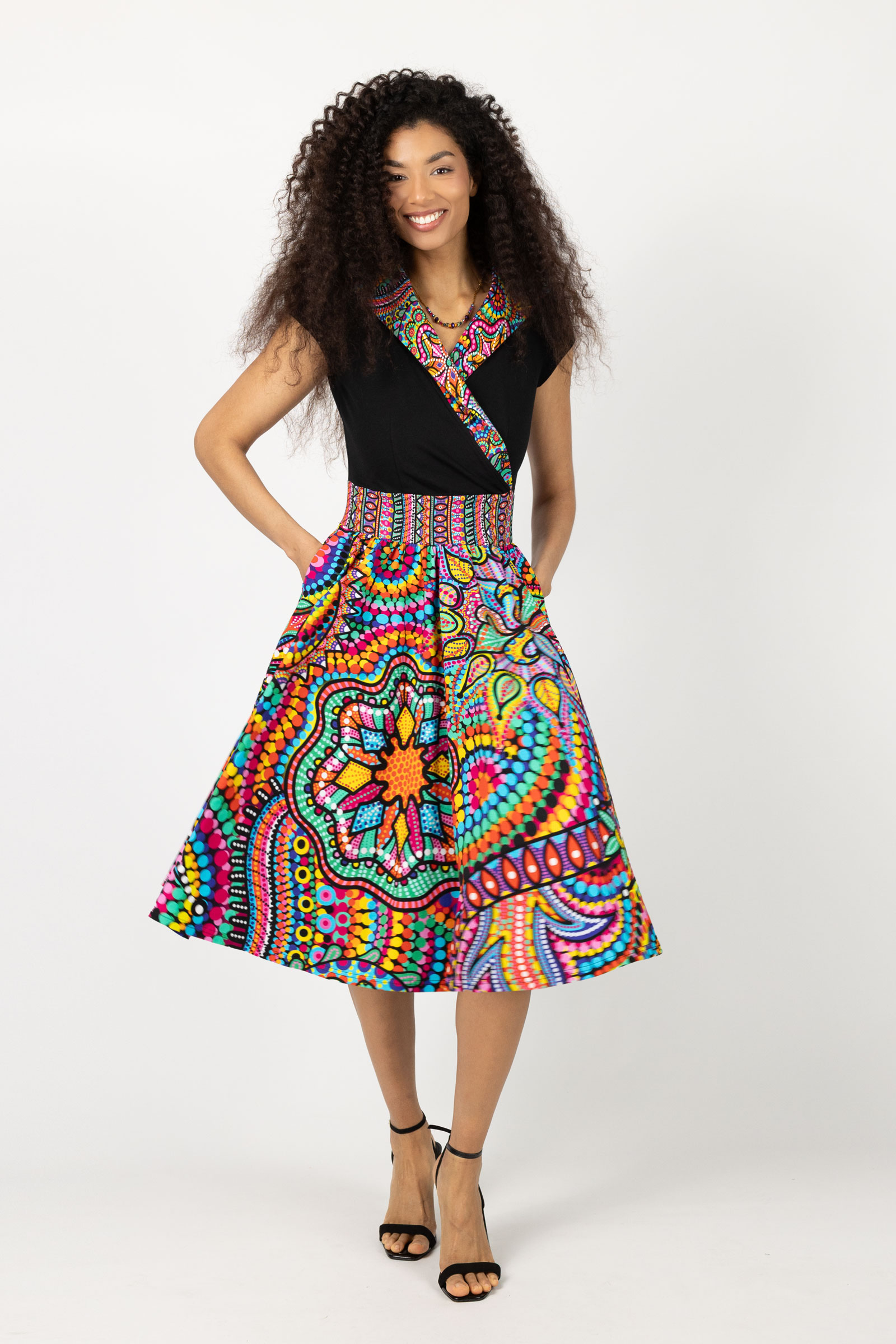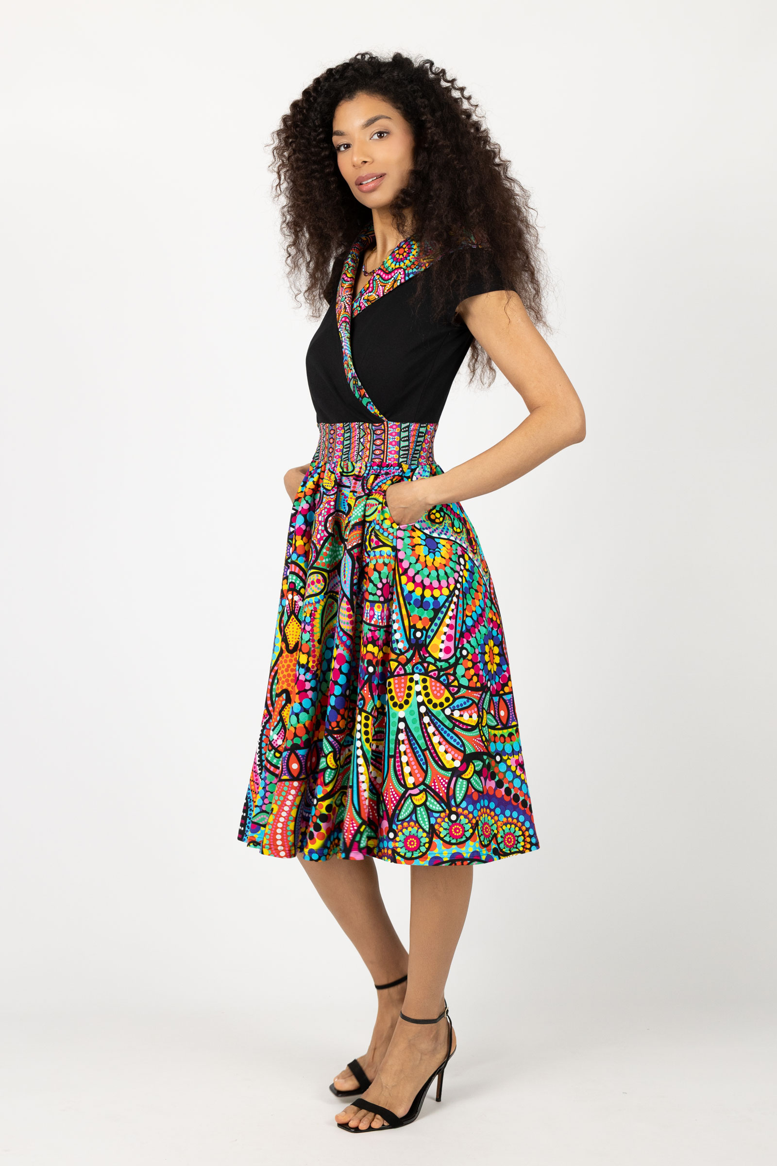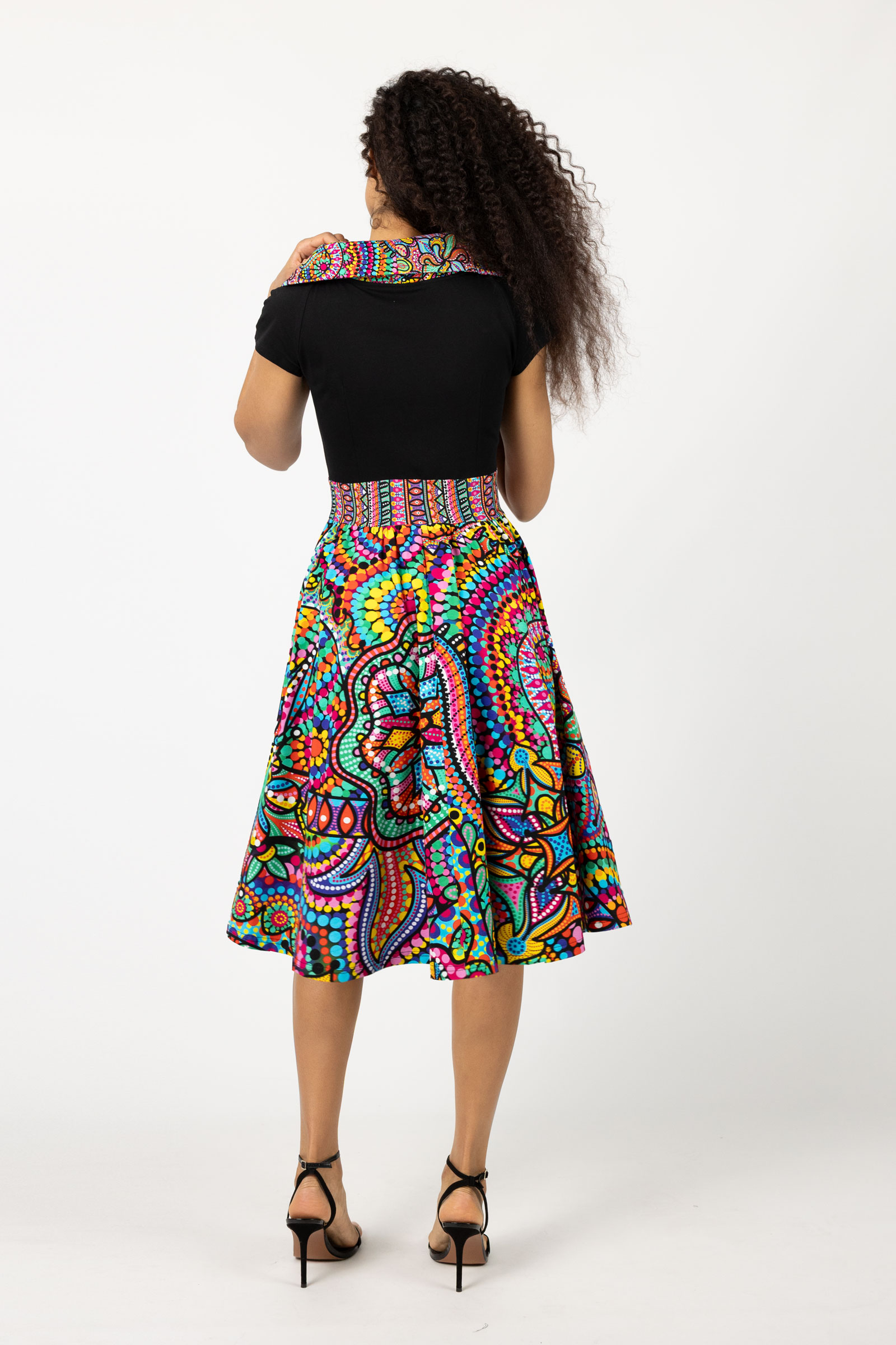 Sukienka midi z kołnierzem, krótki rękaw z czarną górą "CONFETTI" mix i inne wzory