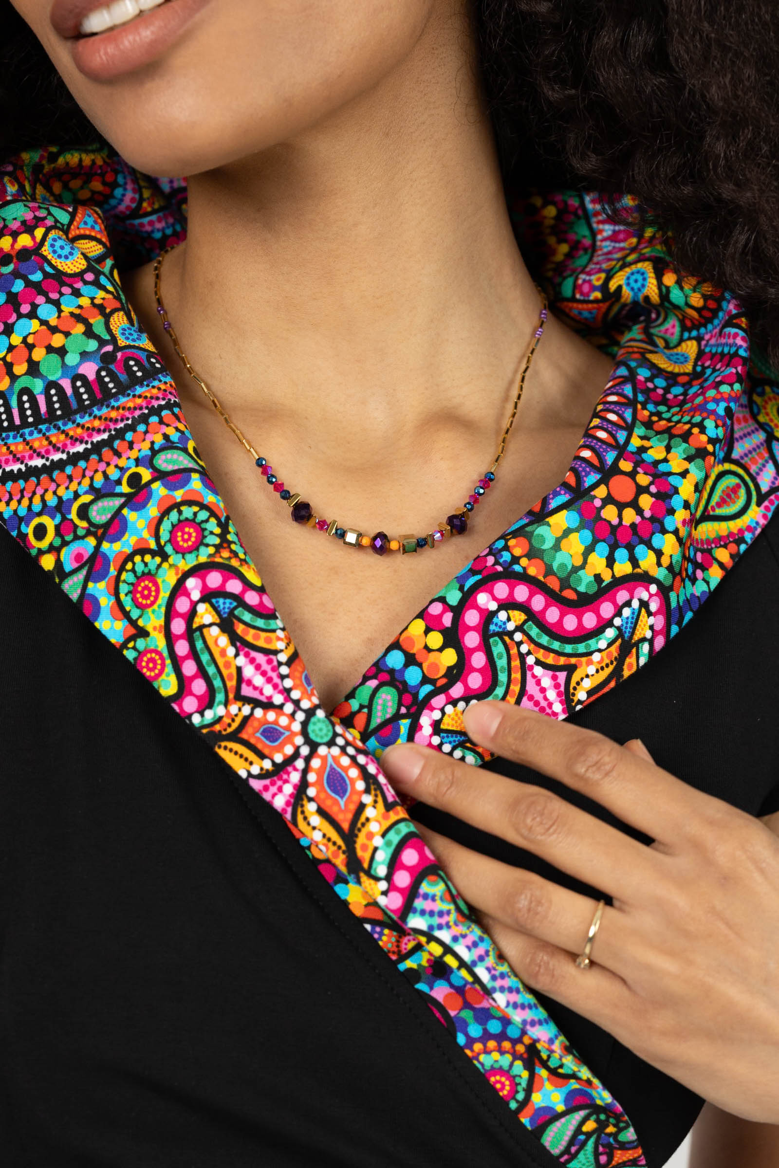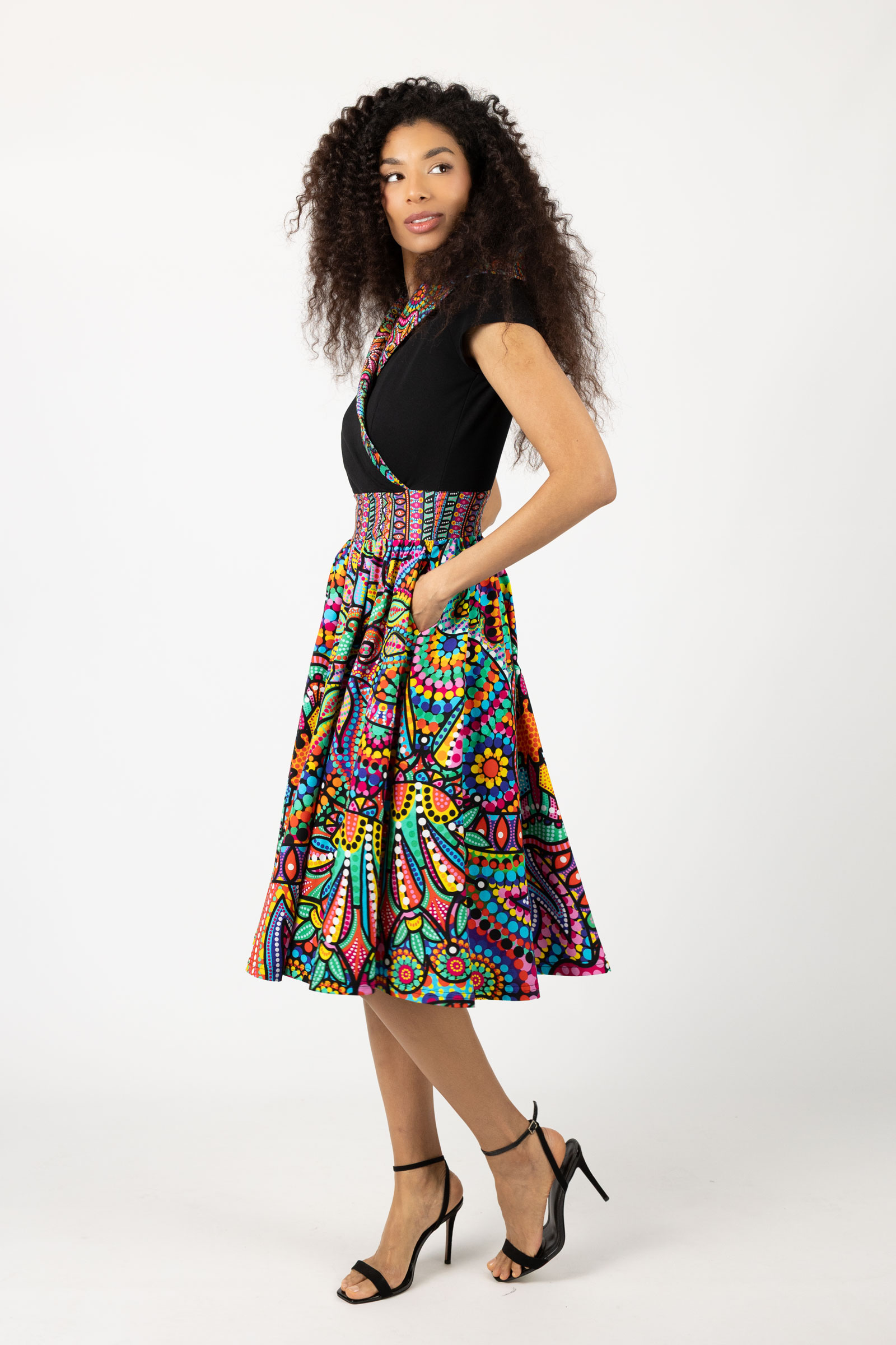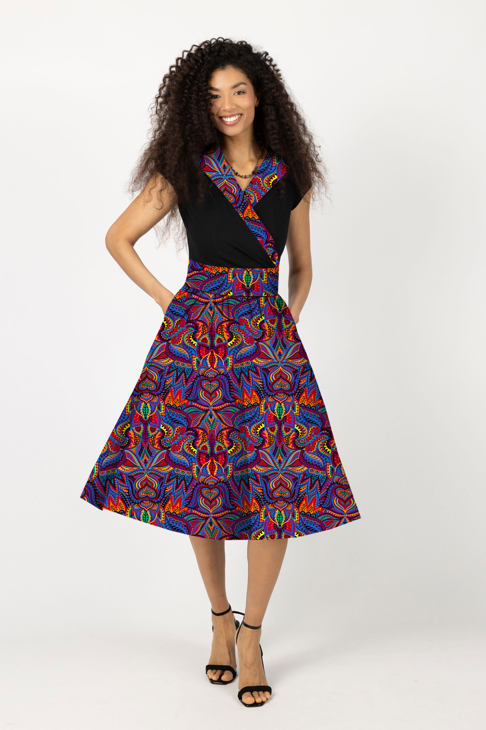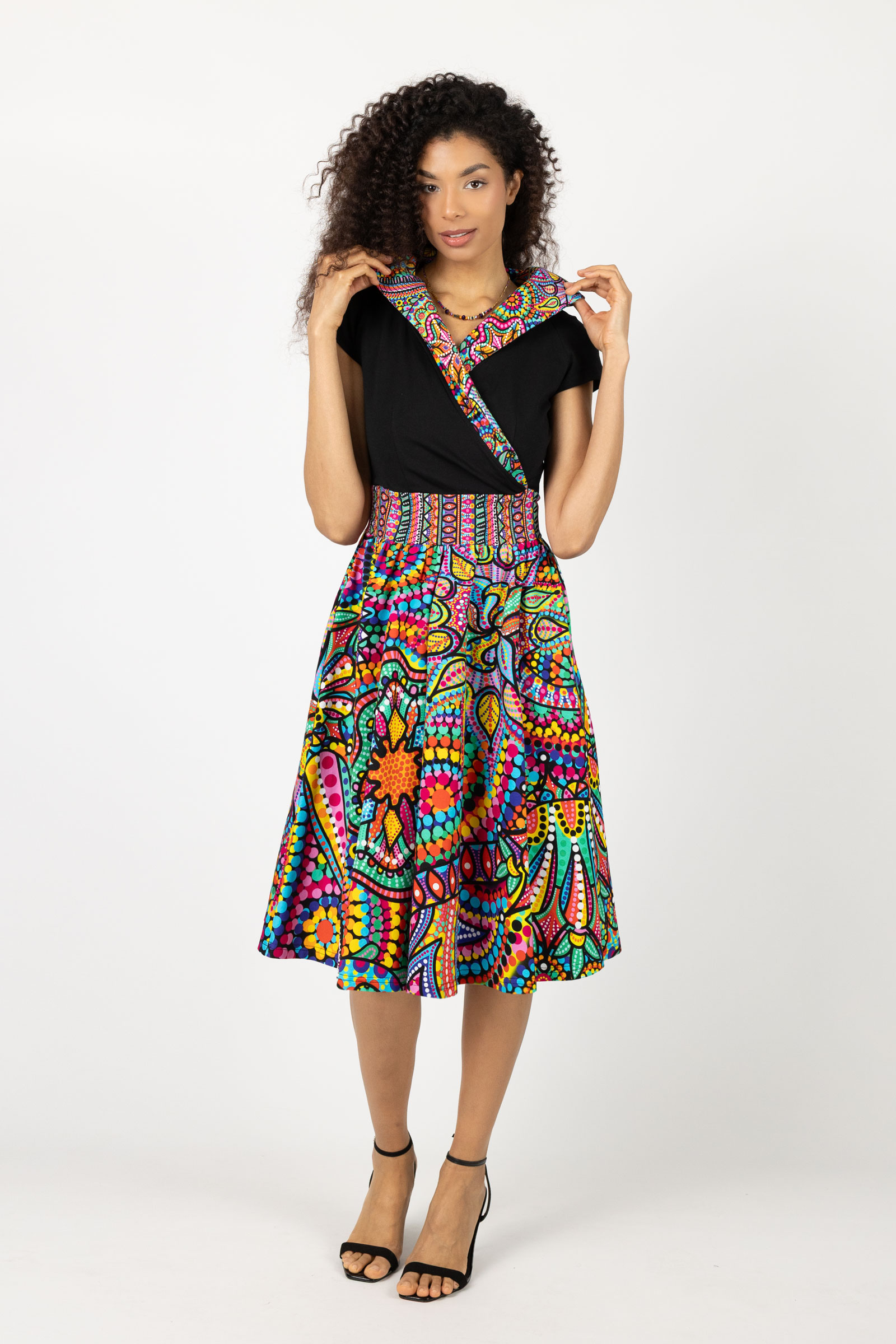 Sukienka midi z kołnierzem, krótki rękaw z czarną górą "CONFETTI" mix i inne wzory