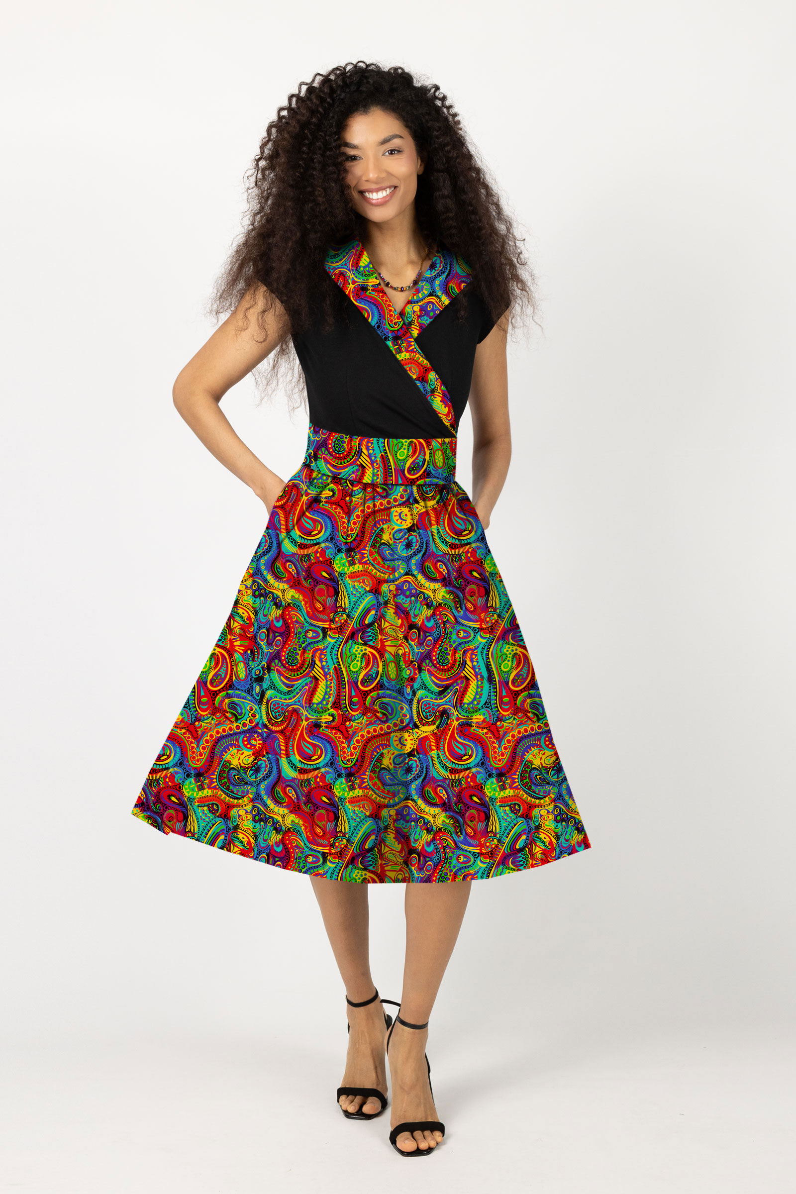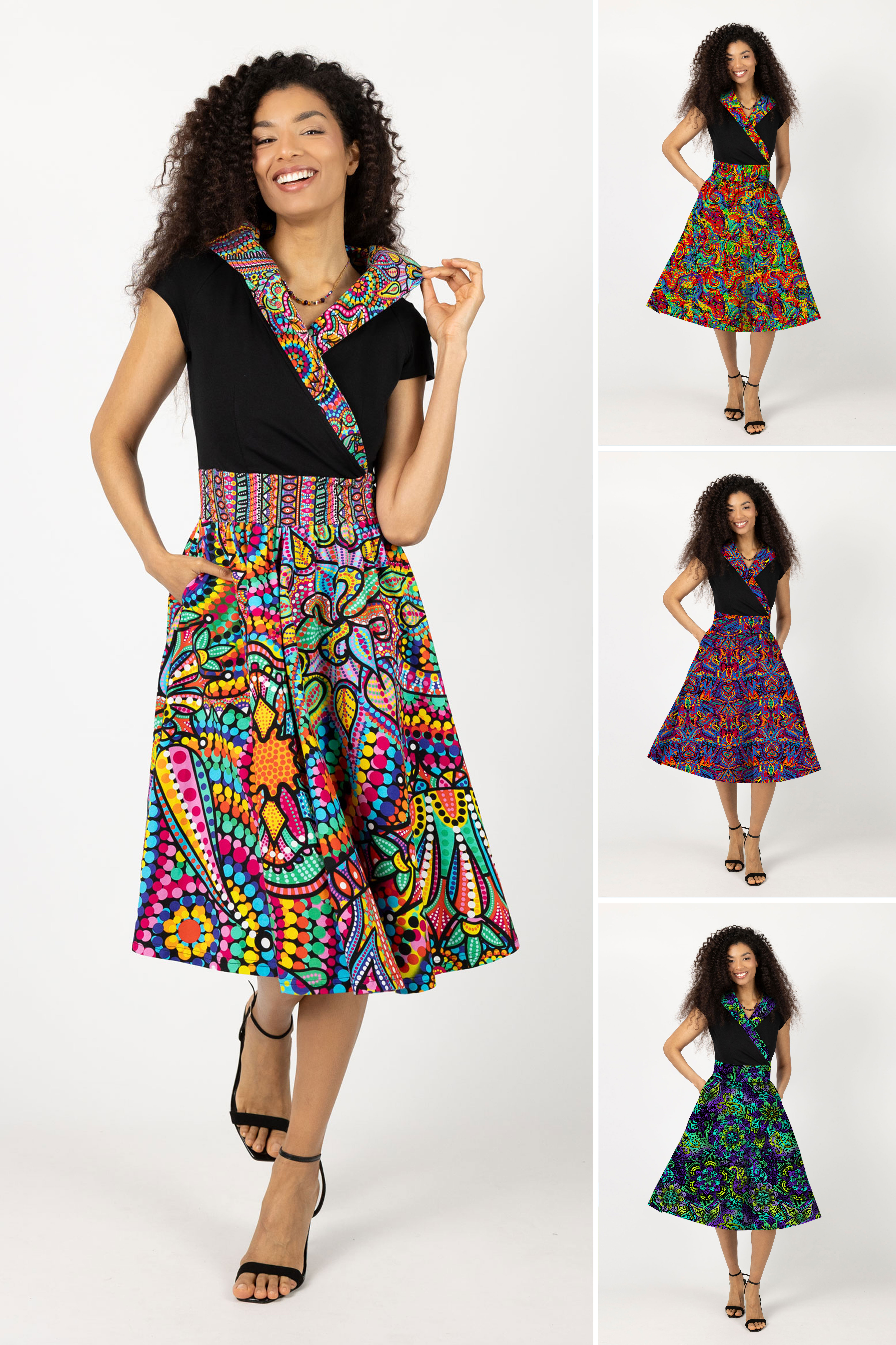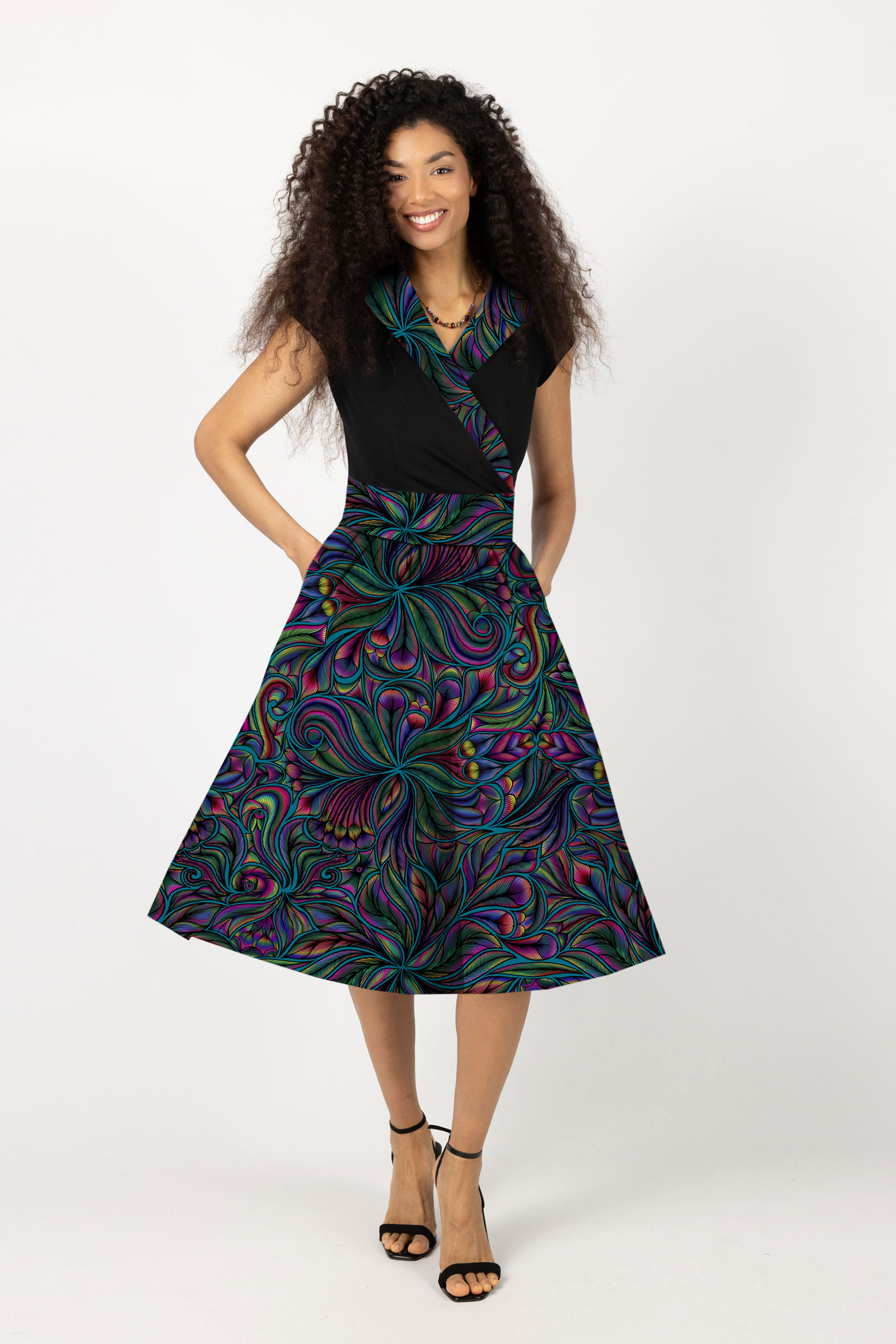 Autorski wzór przyciąga uwagę, a rozkloszowany dół nadaje sukience lekkości i pięknie pracuje w ruchu. W bocznych szwach ukryte kieszenie — praktyczny detal, który nie zaburza formy.
