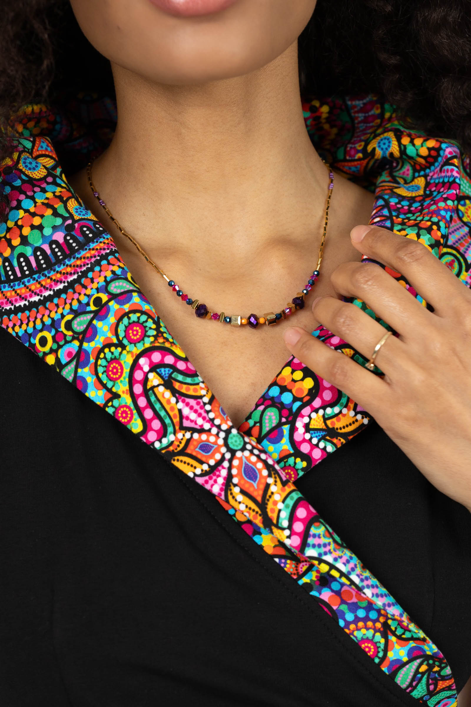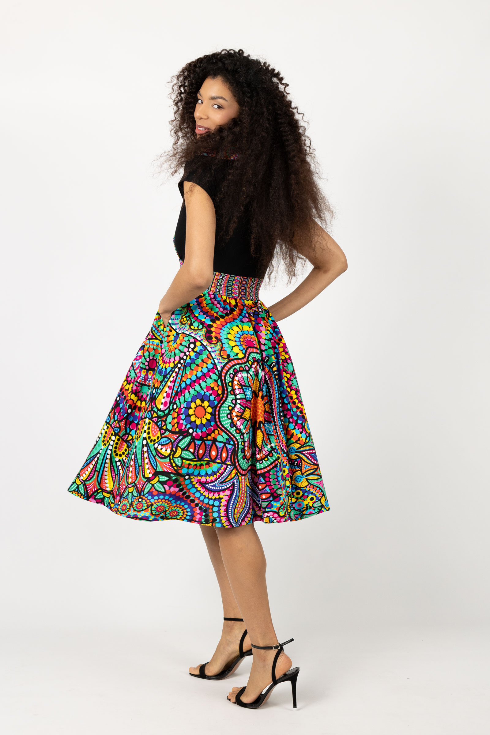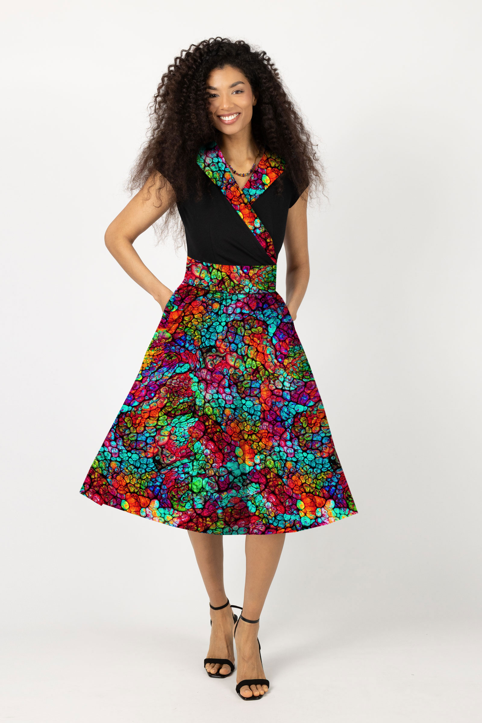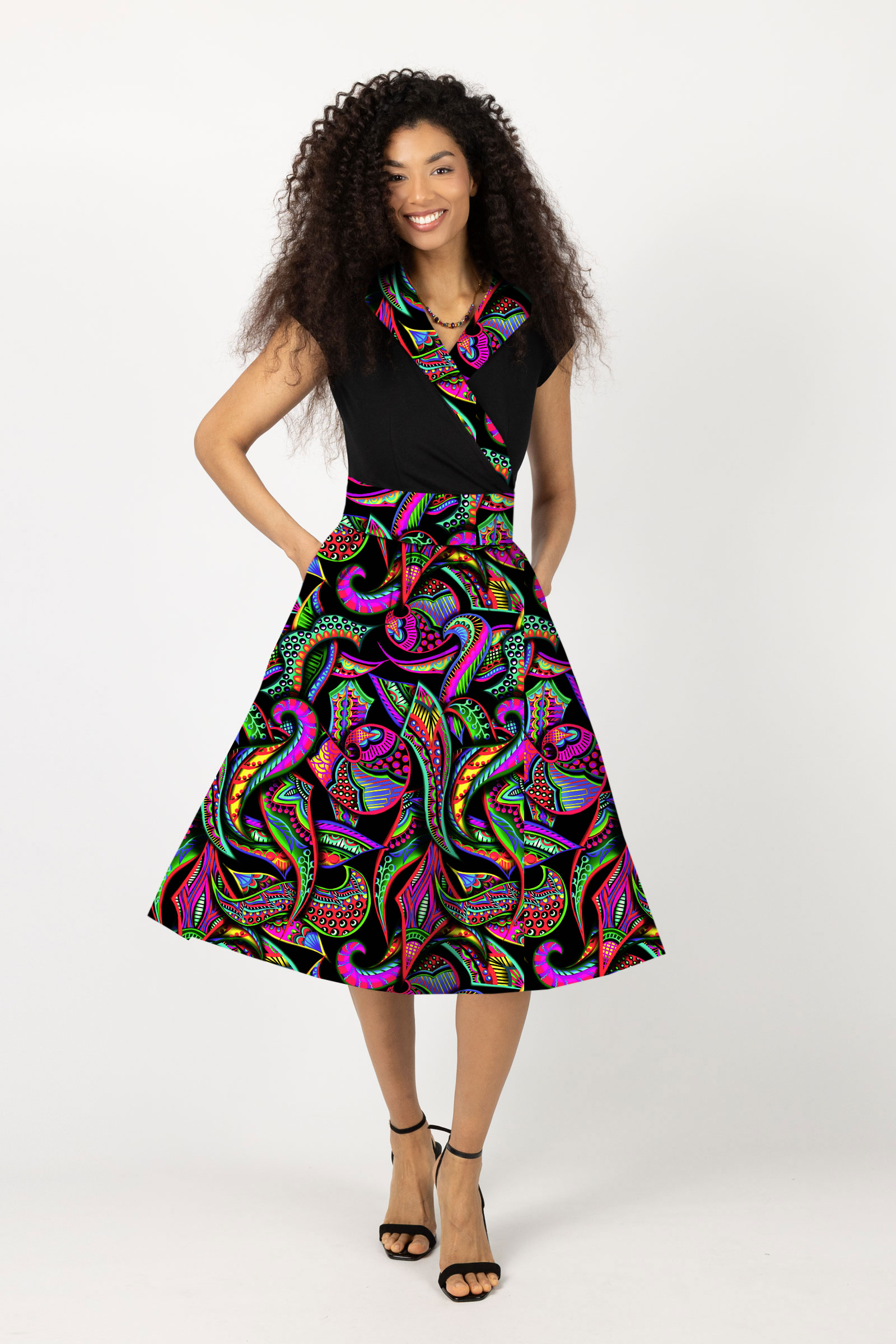 Autorski wzór przyciąga uwagę, a rozkloszowany dół nadaje sukience lekkości i pięknie pracuje w ruchu. W bocznych szwach ukryte kieszenie — praktyczny detal, który nie zaburza formy.