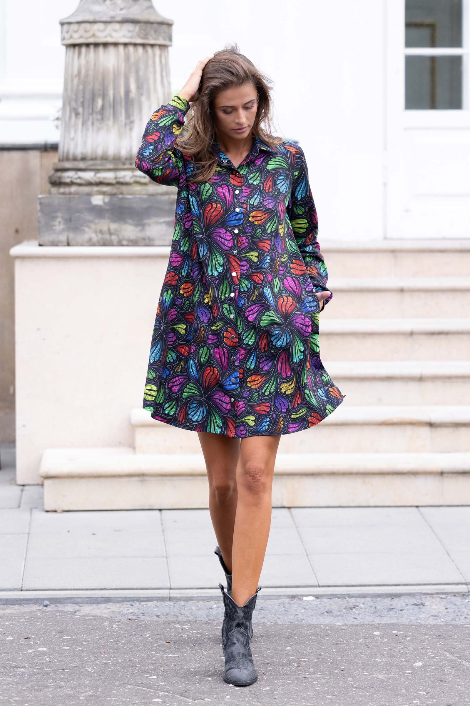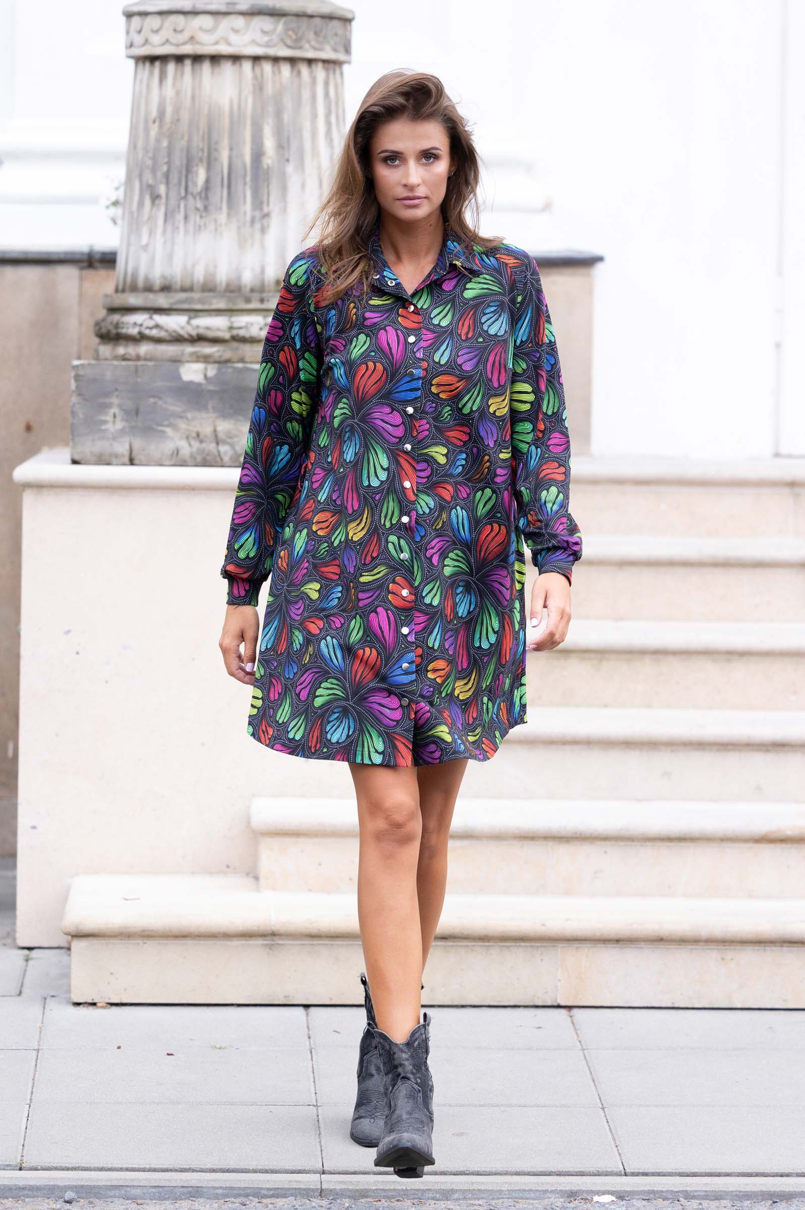 Wzór nadruku na sukience to autorski projekt, dostępny wyłącznie u nas, co sprawia, że każda sukienka jest jedyna w swoim rodzaju. Całość jest szyta w naszej pracowni w Legionowie, z dbałością o każdy detal i najwyższą jakość wykonania.
