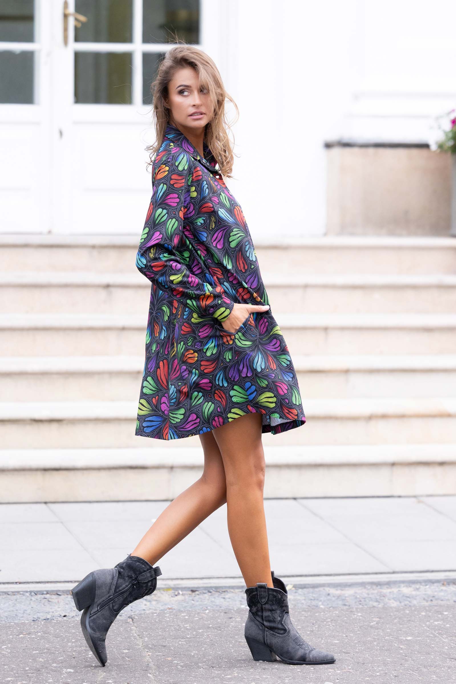 Ta sukienka to idealny wybór na różne okazje – od codziennych spacerów, przez spotkania z przyjaciółmi, aż po bardziej formalne wyjścia. Połączenie komfortu, stylu i unikalnego designu sprawia, że będzie to ulubiony element garderoby.