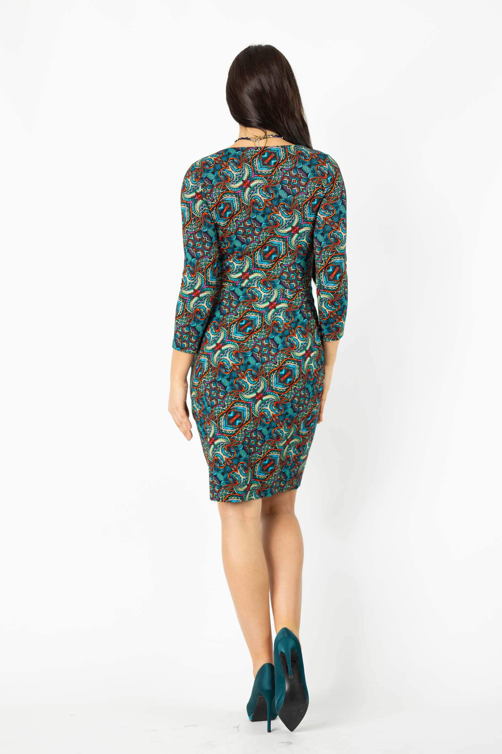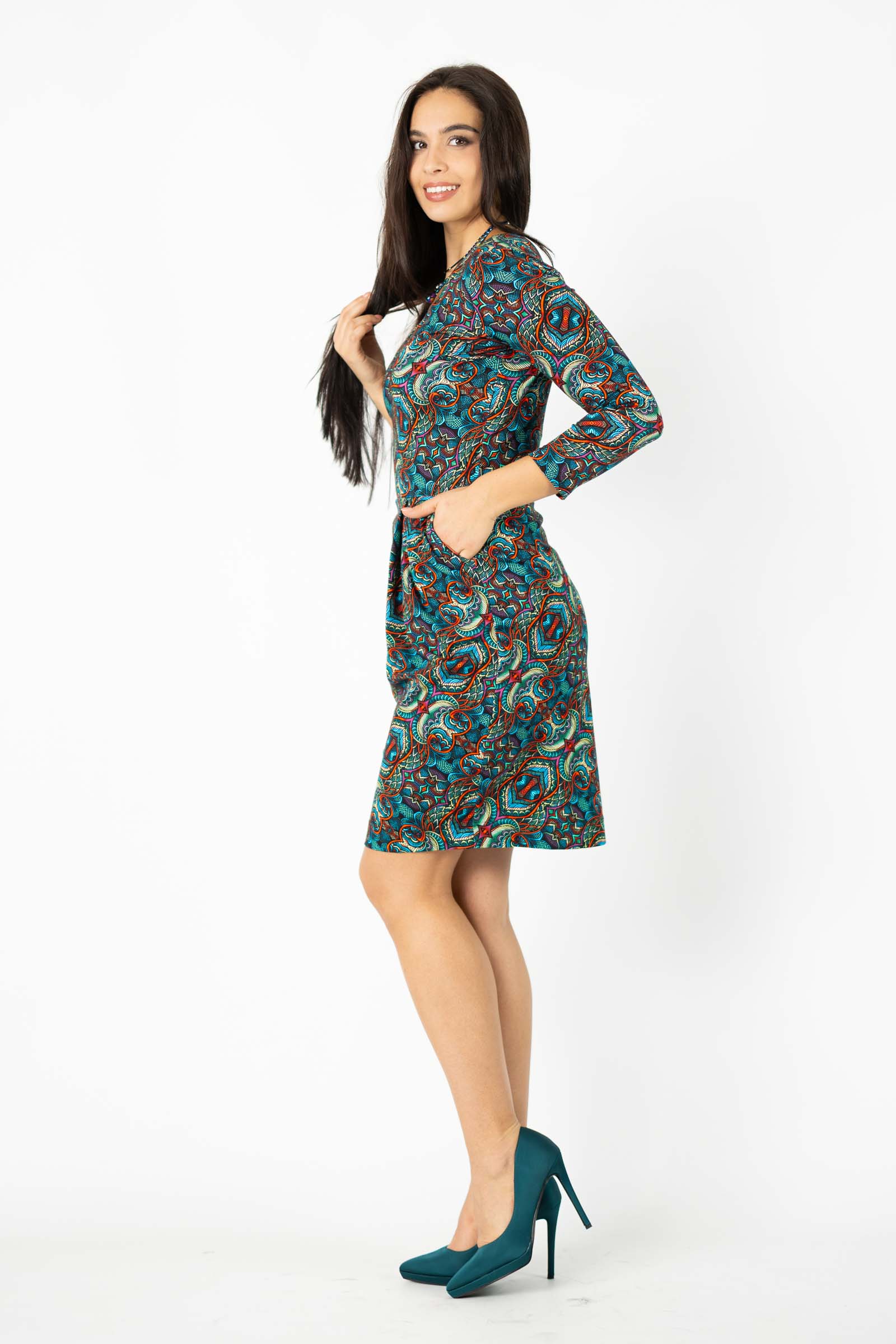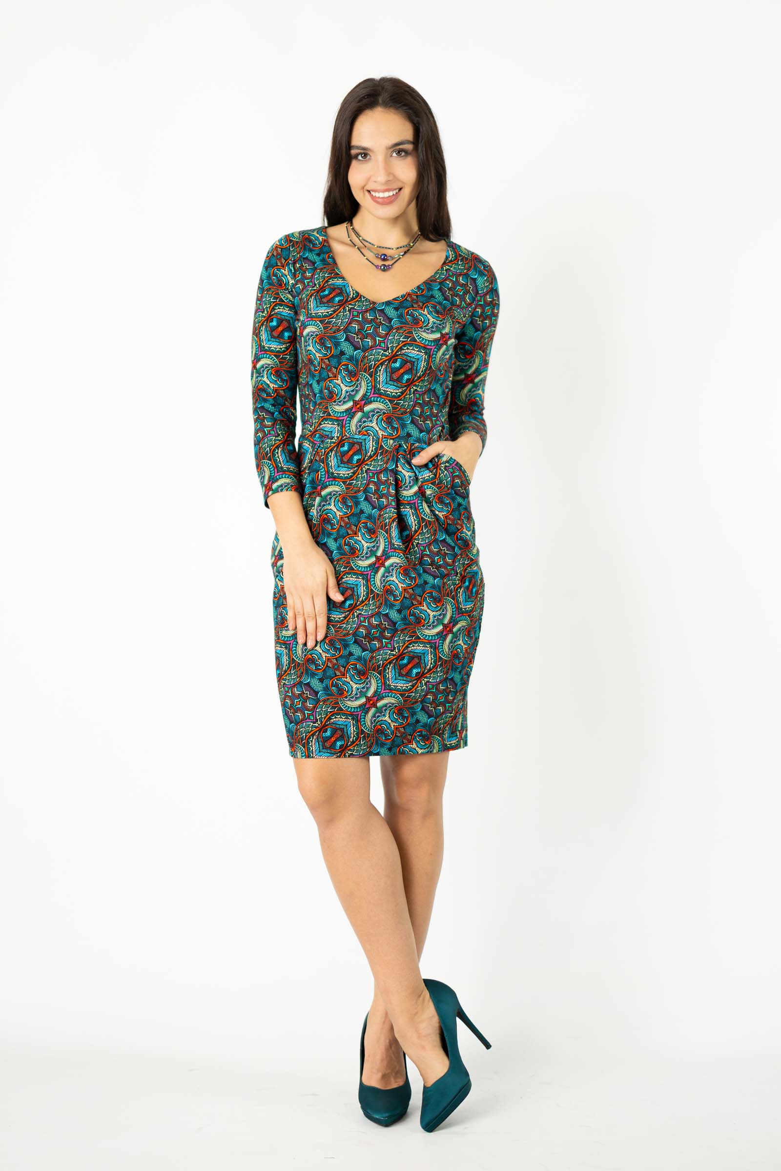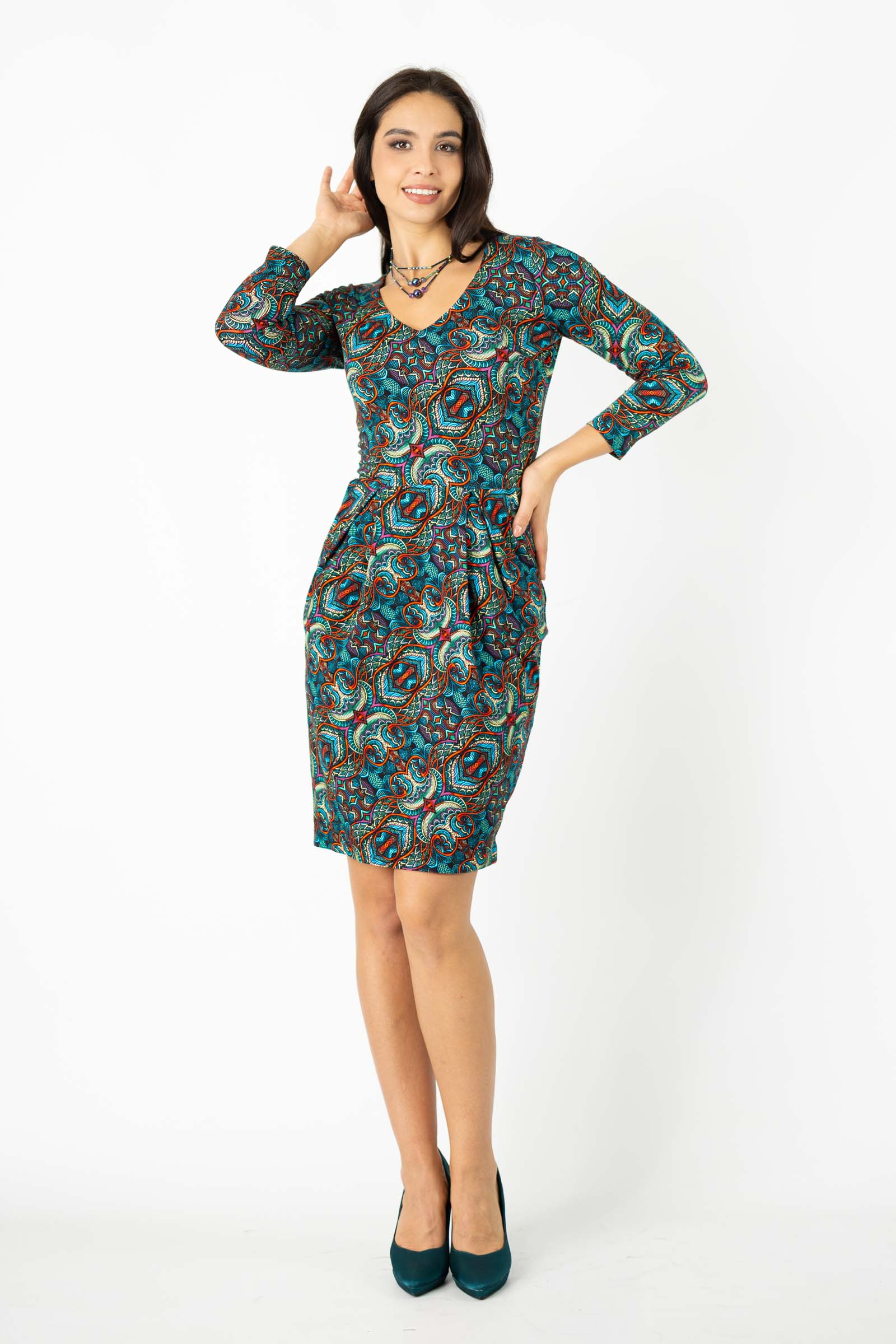 Ta sukienka z pewnością przyciągnie uwagę swoim kobiecym i efektownym stylem. Wykonana z elastycznej bawełnianej dzianiny, jest nie tylko wygodna, ale także podkreśla kobiece kształty. Kieszenie z przodu dodają jej casualowego charakteru, a zakładki w talii dodają elegancji. Dekolt w kształcie litery V optycznie wydłuża sylwetkę,