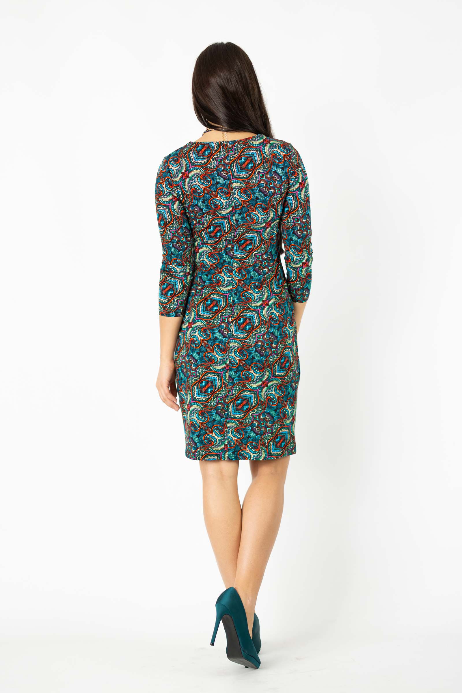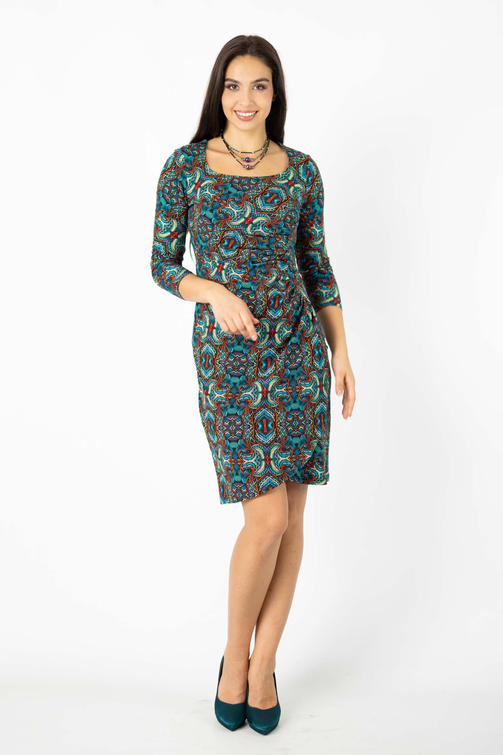 Zaprojektowana przez twórczynię marki Katarzynę Gałaj, autorski wzór materiału, który zdobi tę sukienkę, jest unikalny i dostępny tylko u nas.