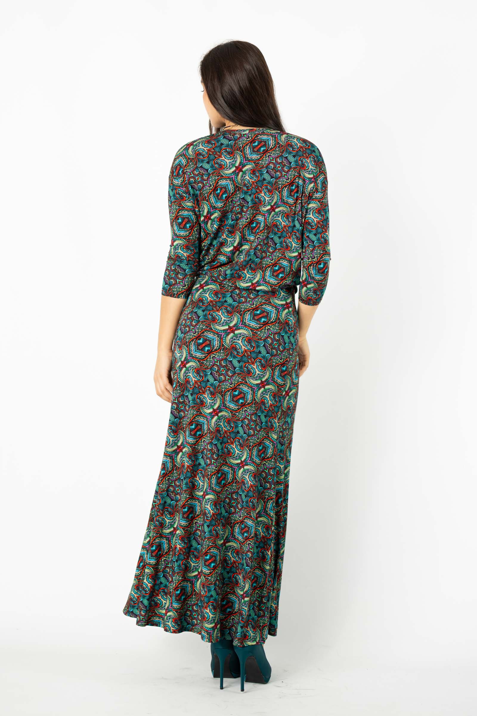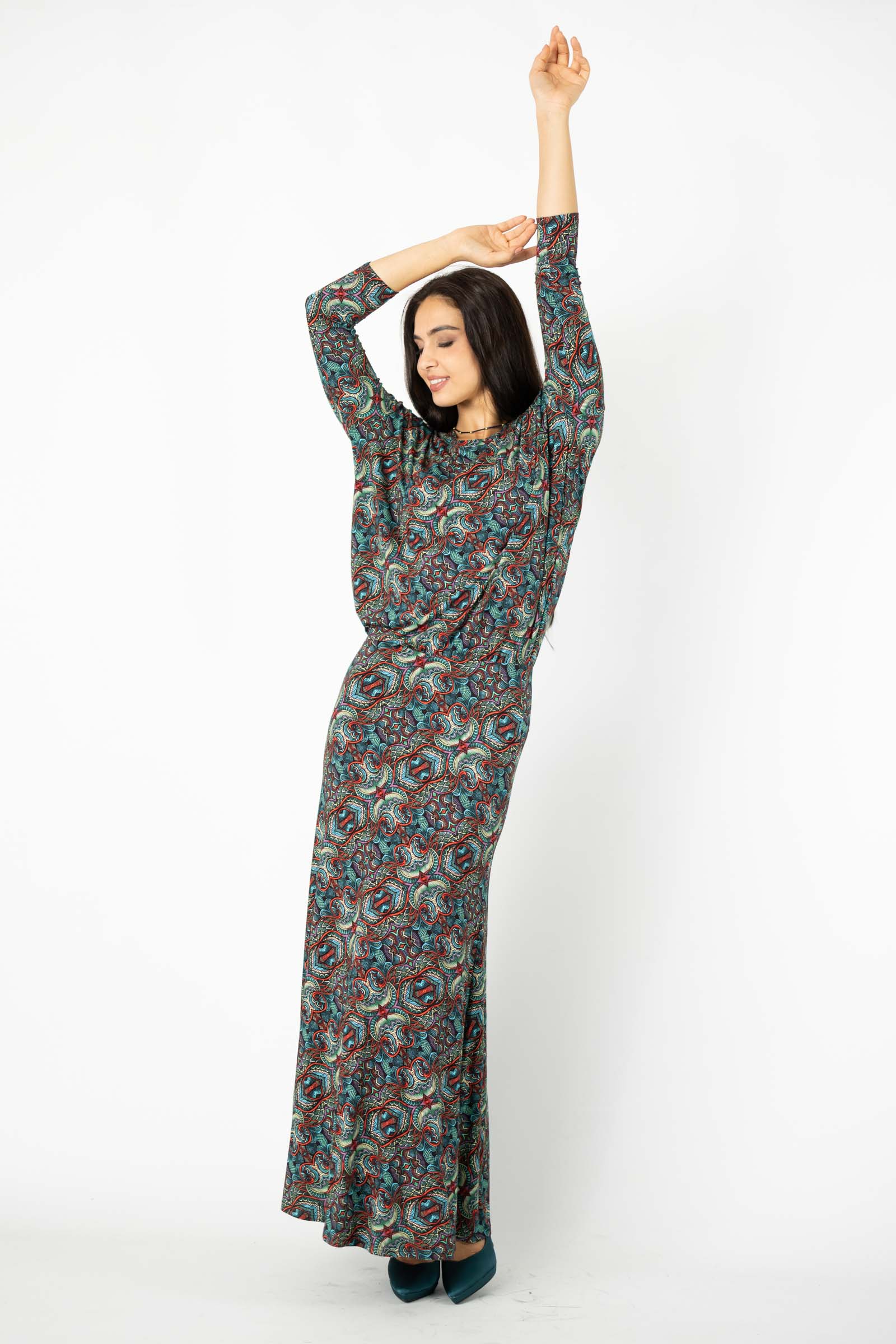 Sukienka maxi uszyta z delikatnej i lejącej wiskozy z autorskim wzorem z pewnością wyróżnia się w tłumie, łącząc niepowtarzalny design z komfortem noszenia.