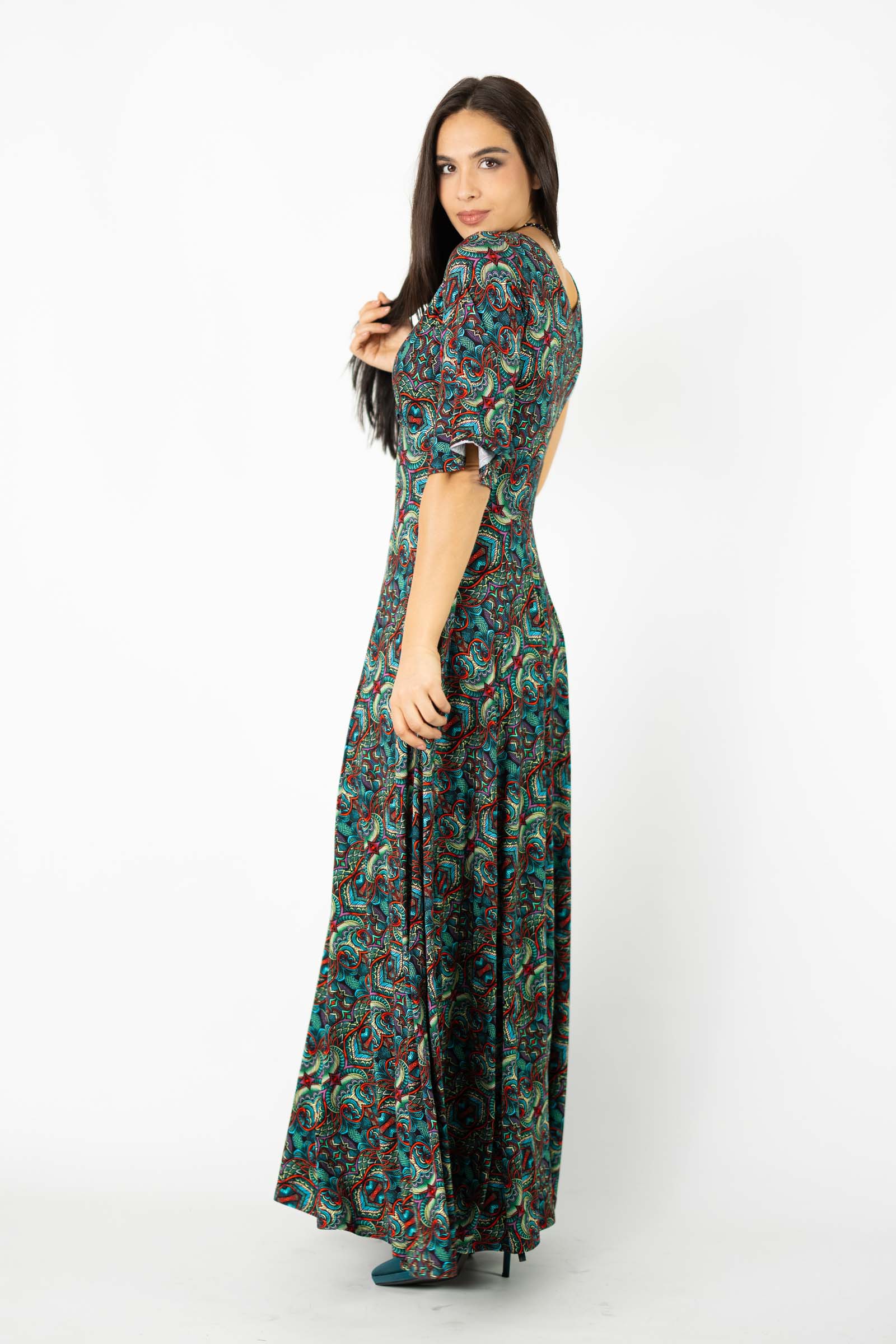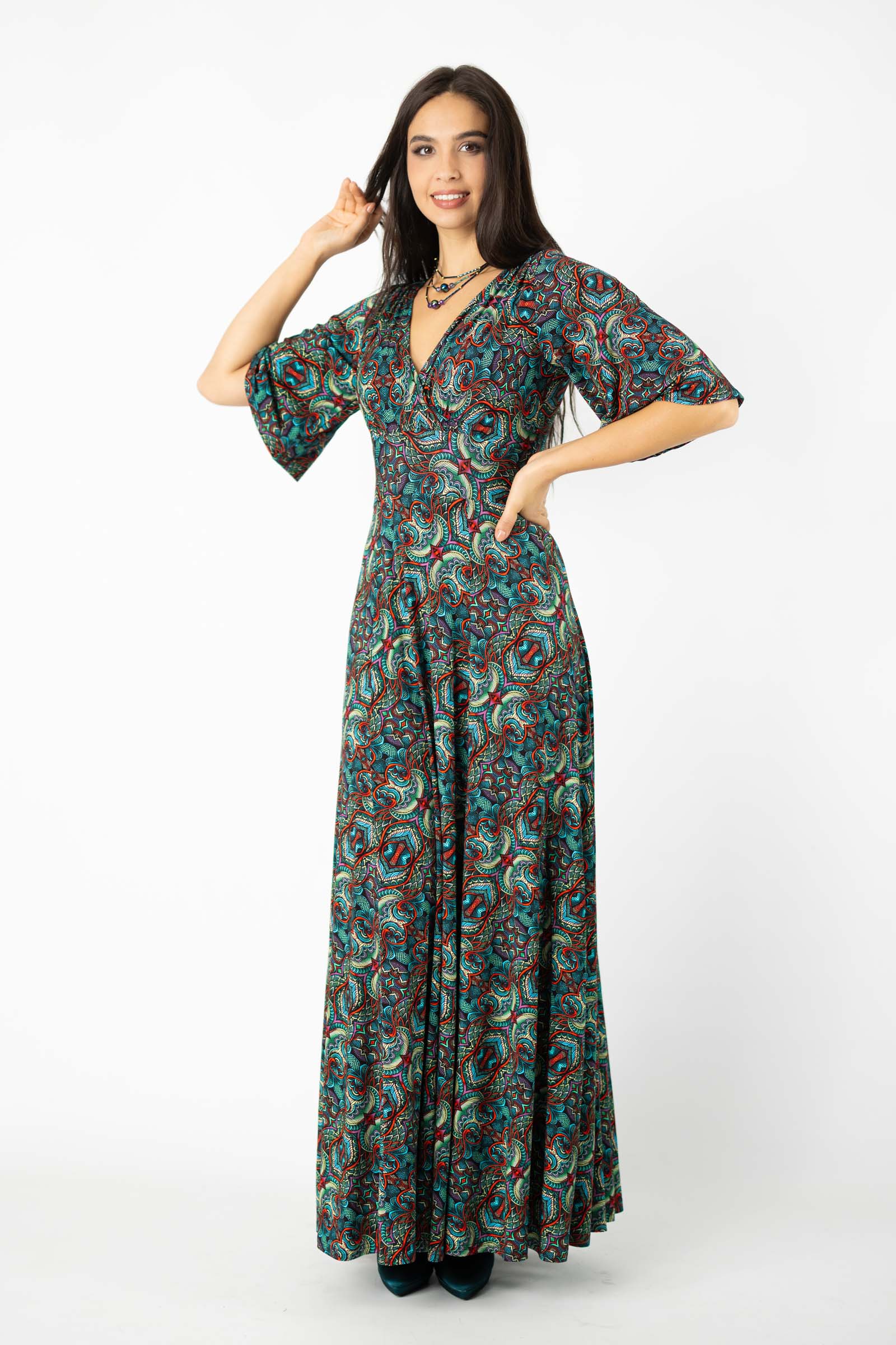 Kopertowy dekolt pięknie podkreśla linię szyi i dekoltu, wnosząc subtelny akcent zmysłowości. Szerokie, luźne rękawy dodają całości lekkości i elegancji, a rozkloszowany dół nadaje sukience zwiewności i sprawia, że wspaniale prezentuje się w ruchu. Idealna na wyjątkowe okazje, ta sukienka przyciąga uwagę swoim oryginalnym wzornictwem i ponadczasowym krojem.