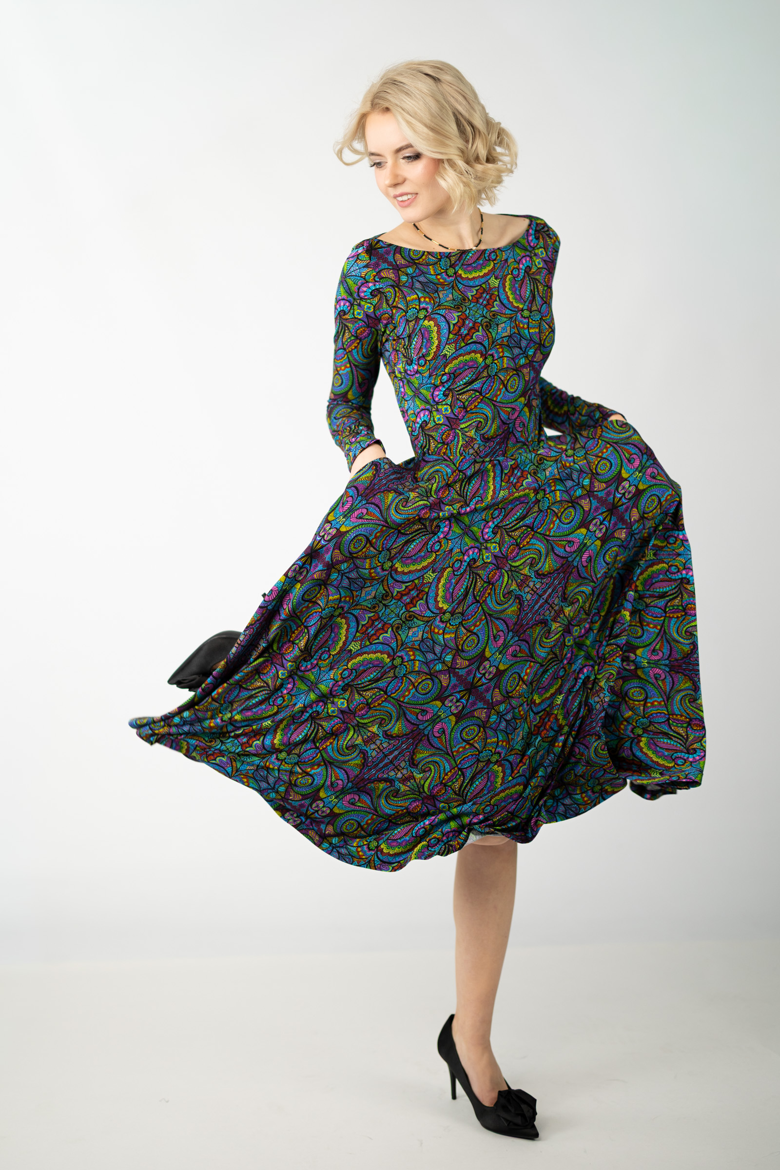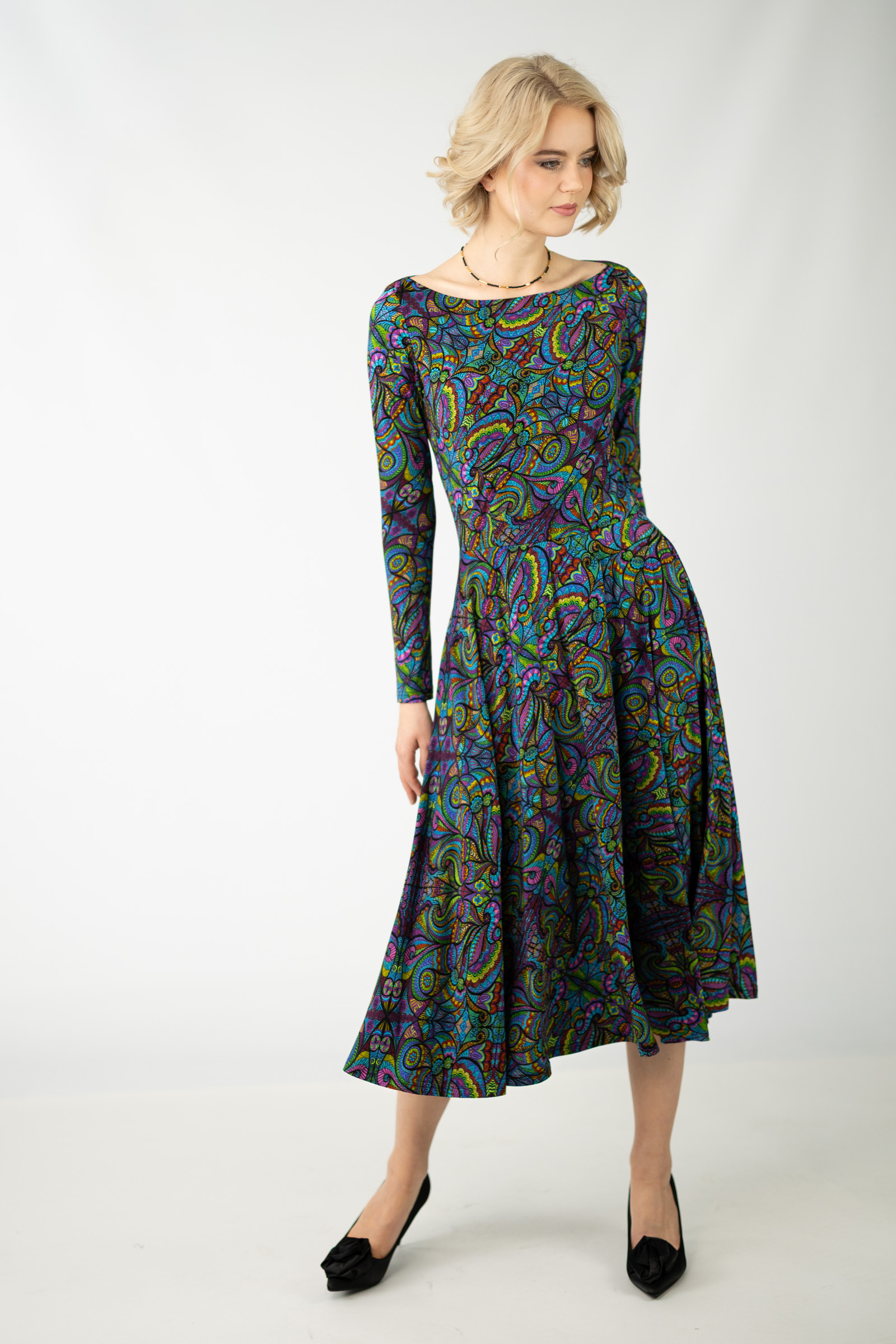 Dekolt w łódkę i dopasowana góra sukienki tworzą wyrafinowaną całość. Autorski wzór, bogaty w detale i unikalne motywy, nadaje sukience niepowtarzalny charakter, wyrażając osobistą kreatywność i styl kobiety.