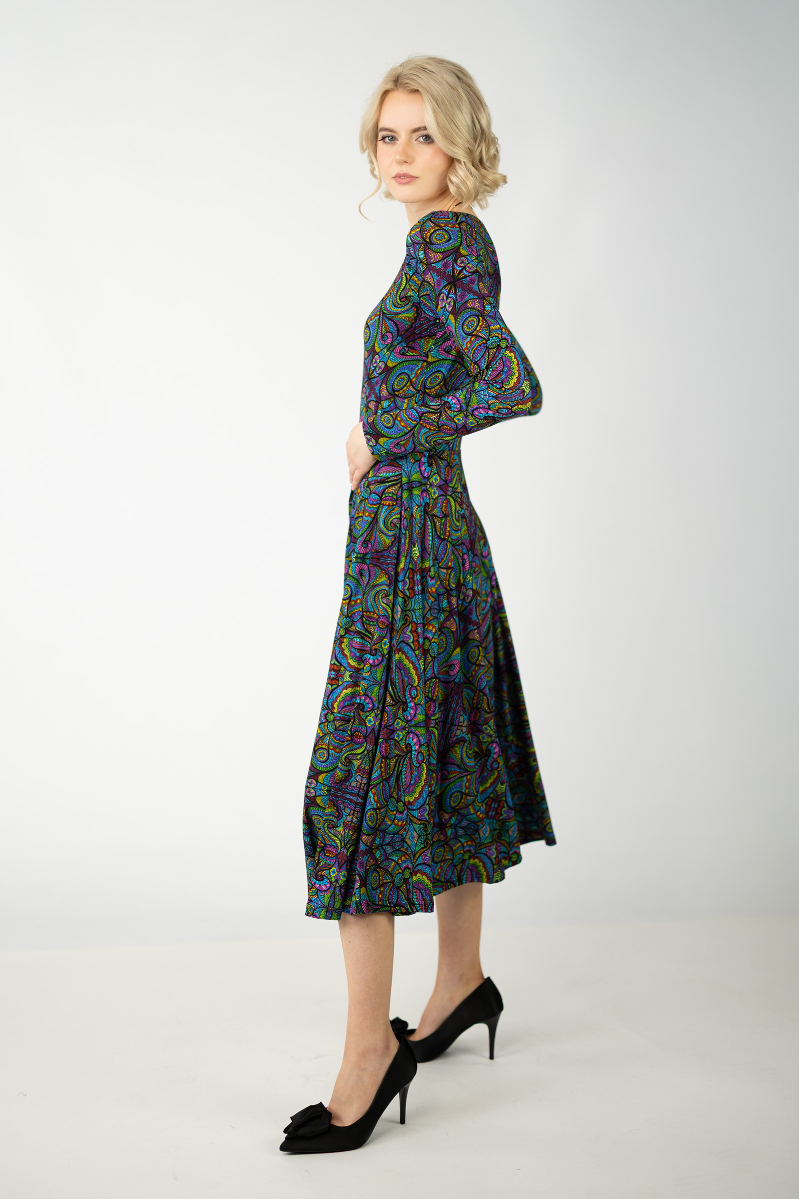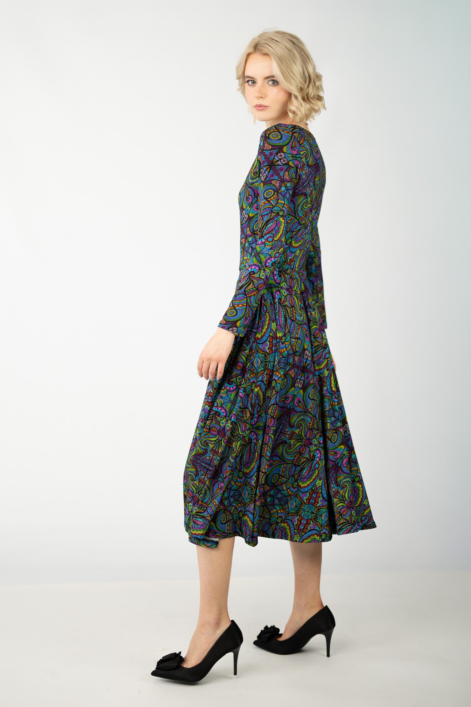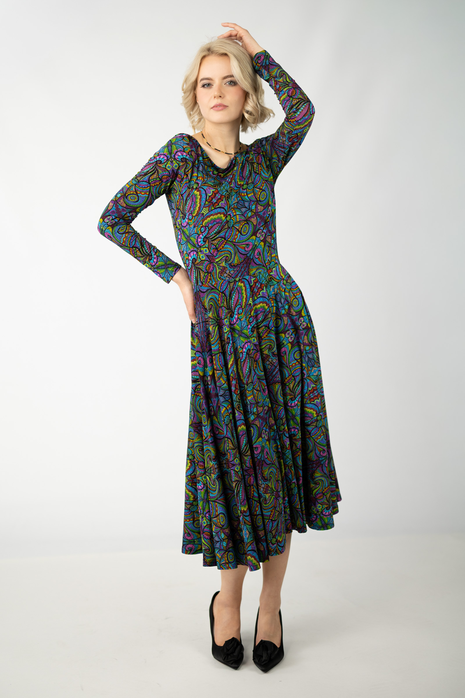 Sukienka midi z autorskim wzorem z pewnością wyróżnia się w tłumie, łącząc niepowtarzalny design i komfort noszenia. Uszyta z lejącej wiskozy, sprawia, że kobieta czuje się stylowo i swobodnie.