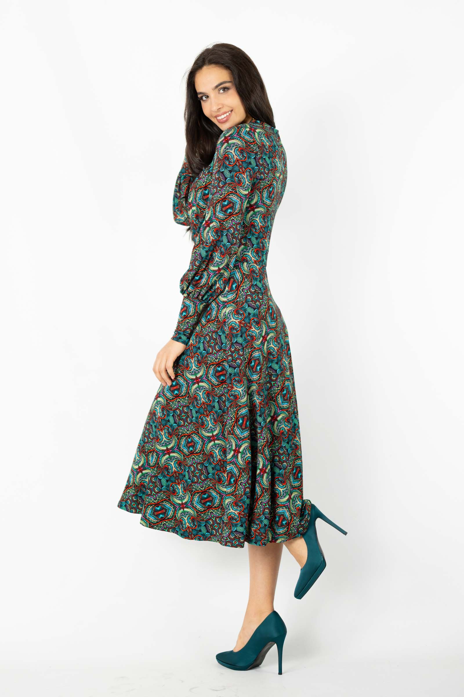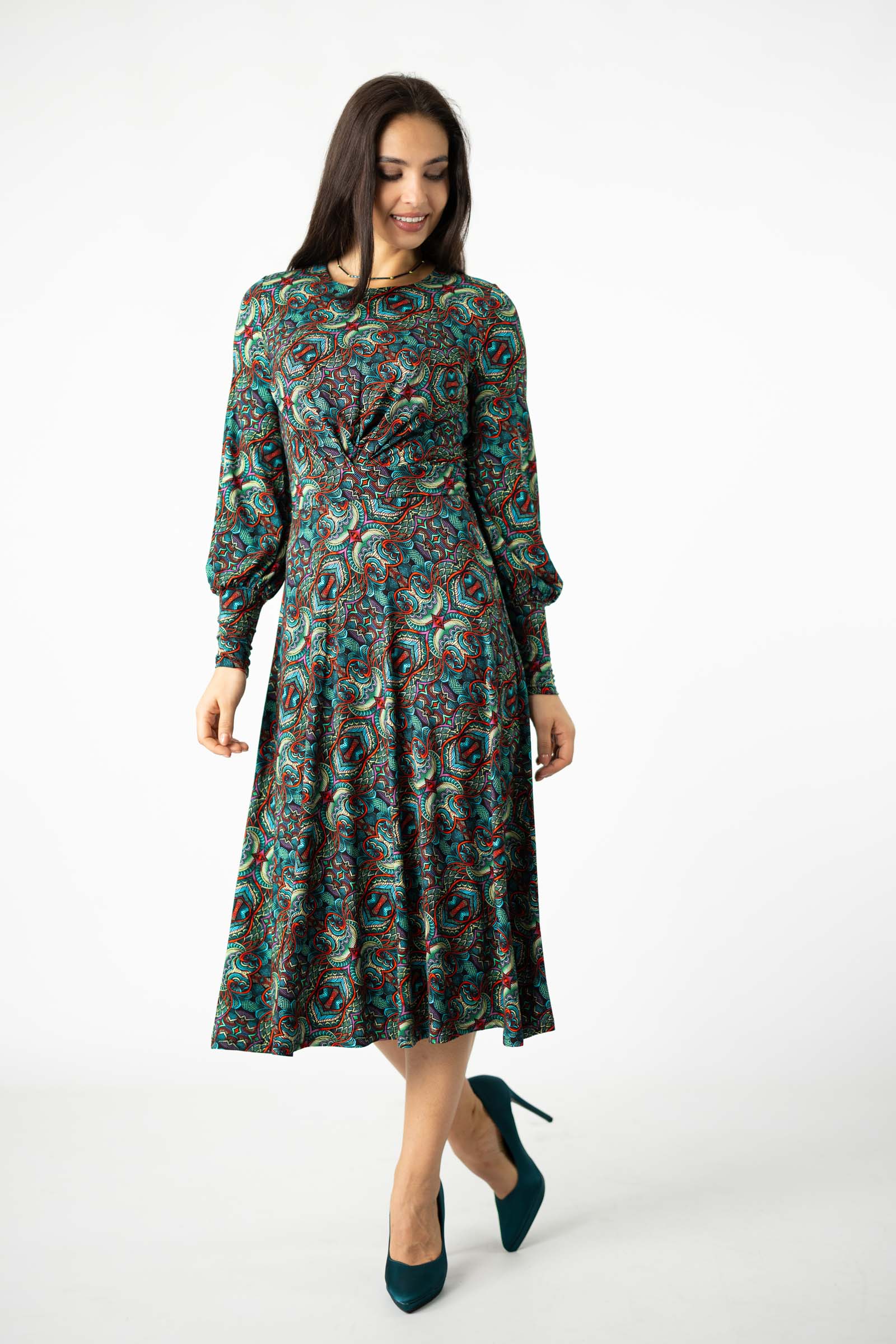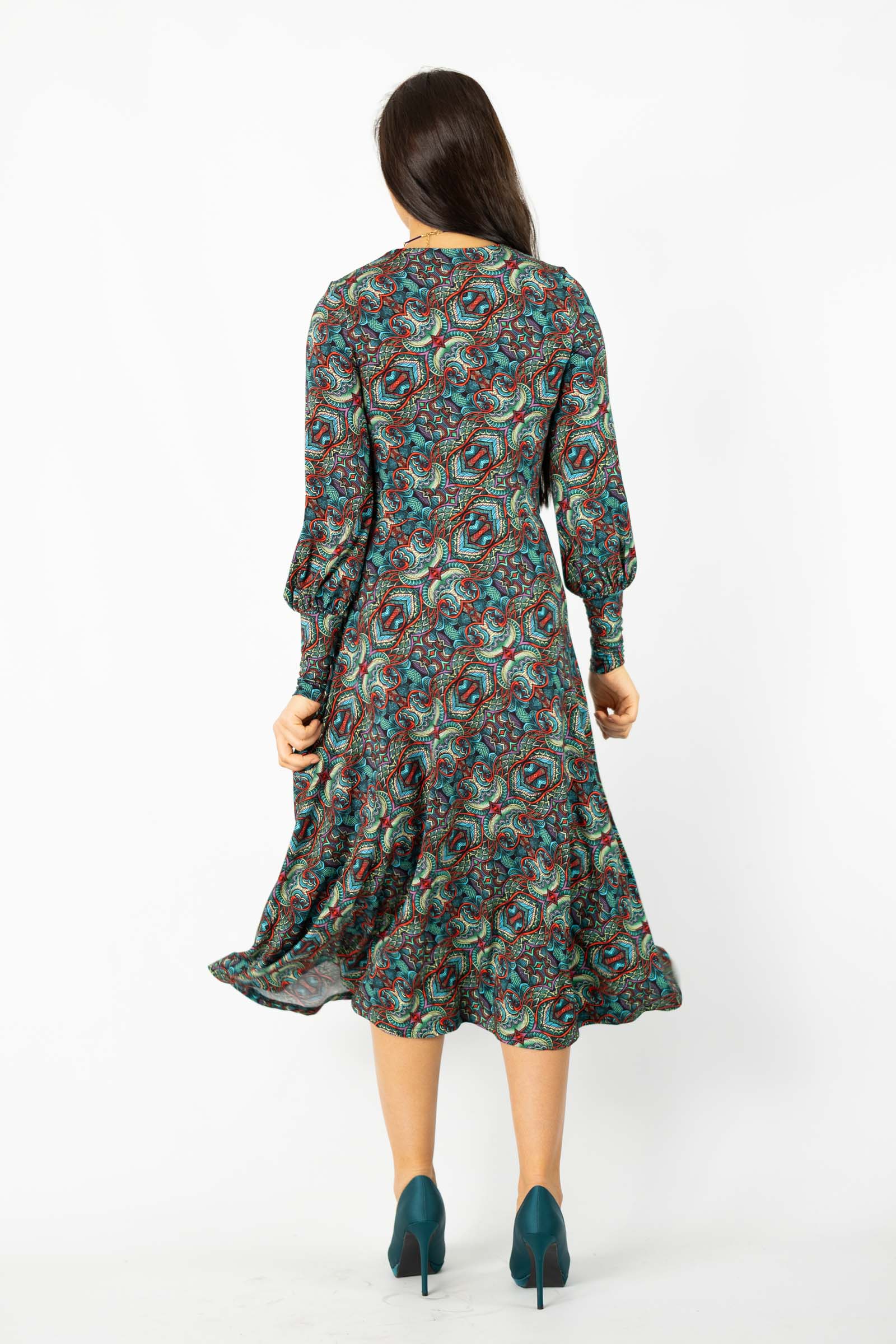 Zaprojektowany przez twórczynię marki Katarzynę Gałaj, autorski wzór materiału, który zdobi tę sukienkę, jest unikalny i dostępny tylko u nas.
