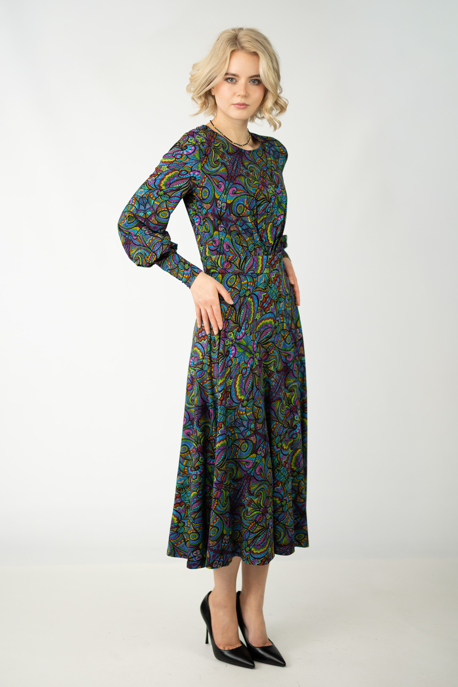 Zaprojektowany przez twórczynię marki Katarzynę Gałaj, autorski wzór materiału, który zdobi tę sukienkę, jest unikalny i dostępny tylko u nas.