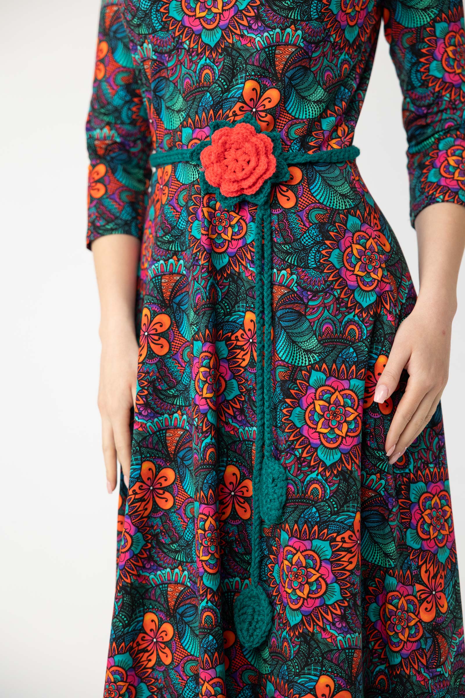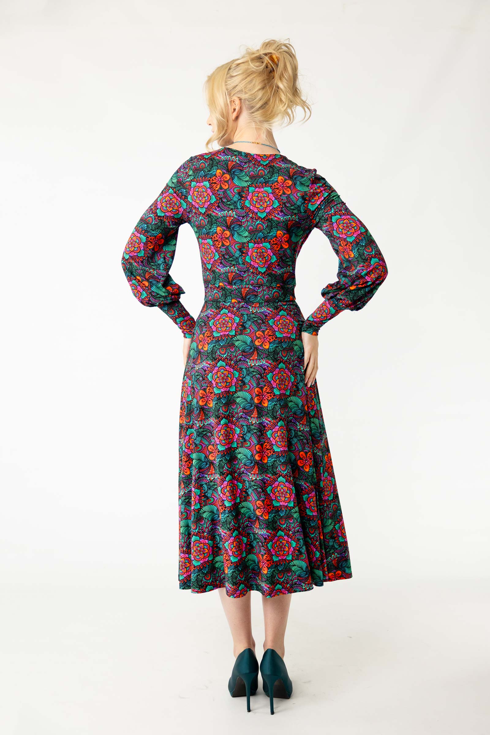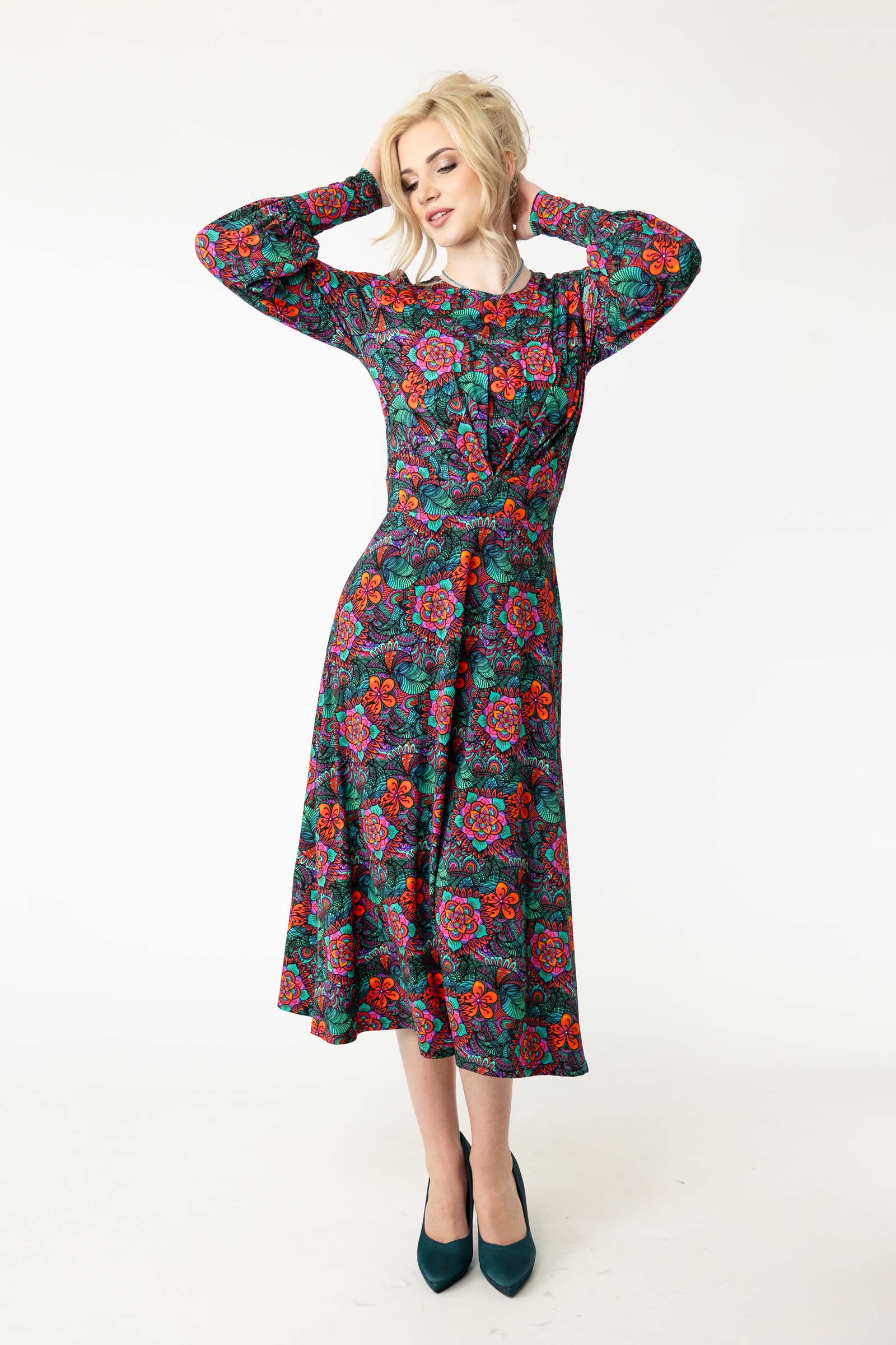 Zaprojektowany przez twórczynię marki Katarzynę Gałaj, autorski wzór materiału, który zdobi tę sukienkę, jest unikalny i dostępny tylko u nas.